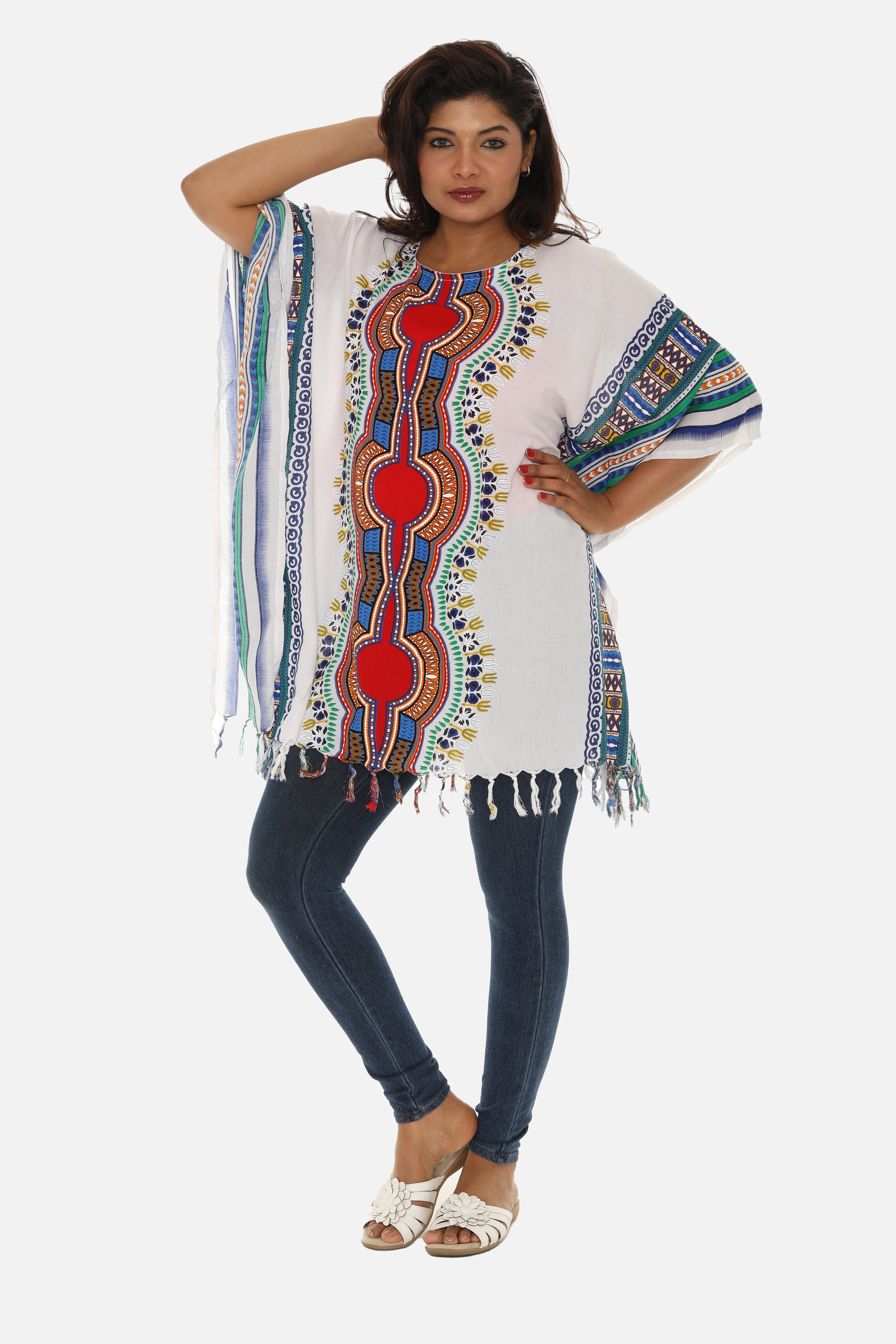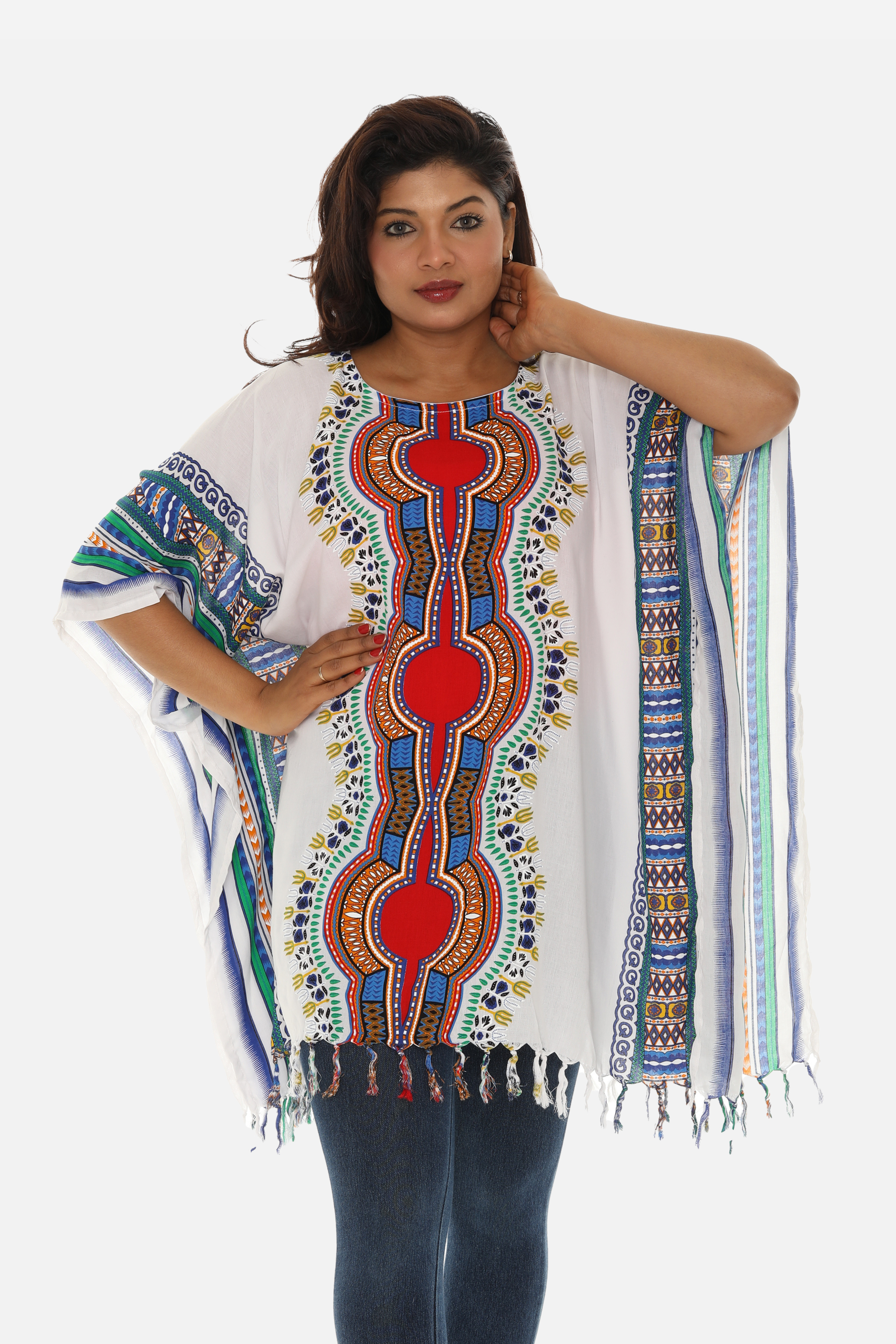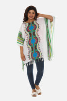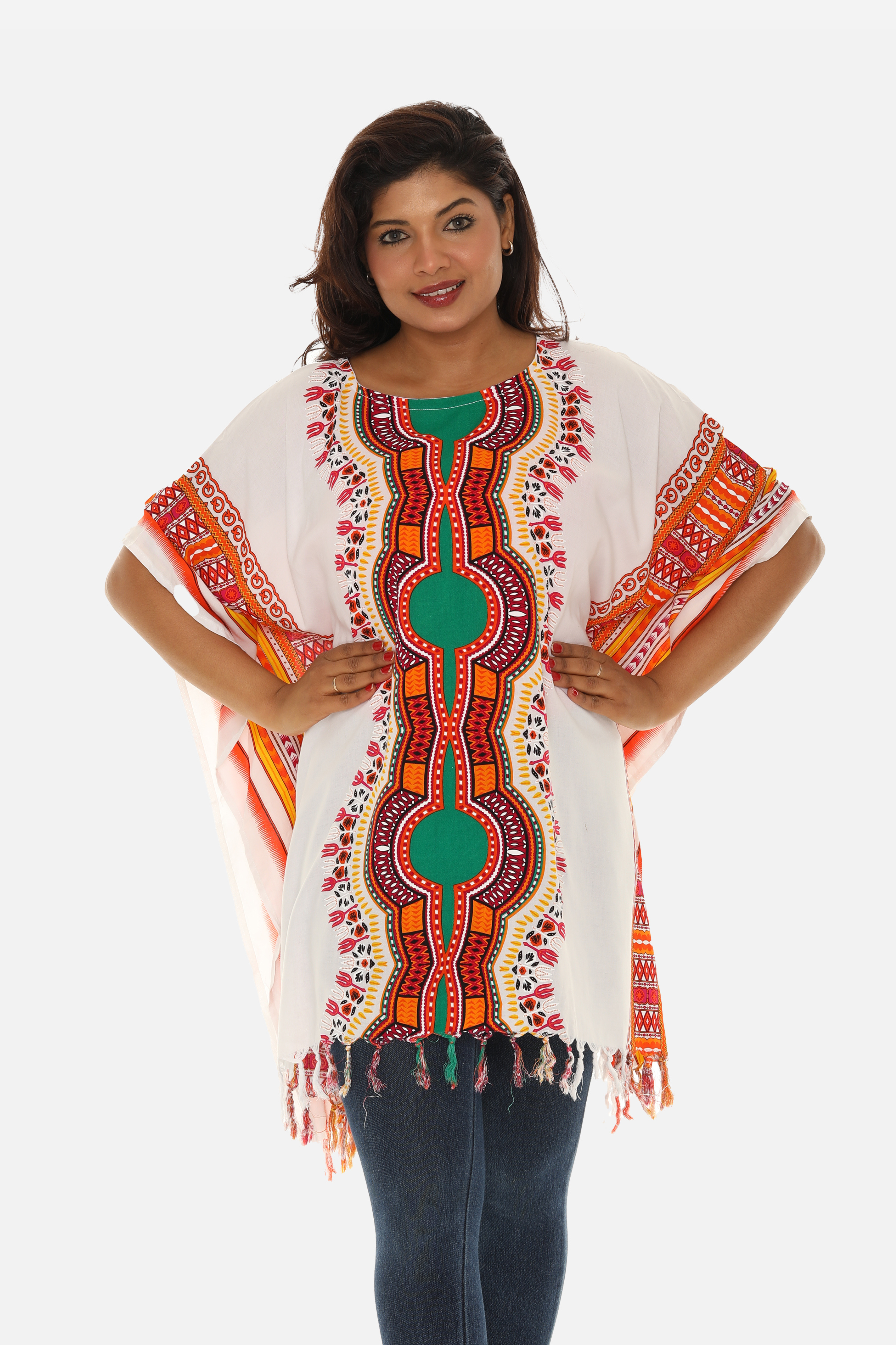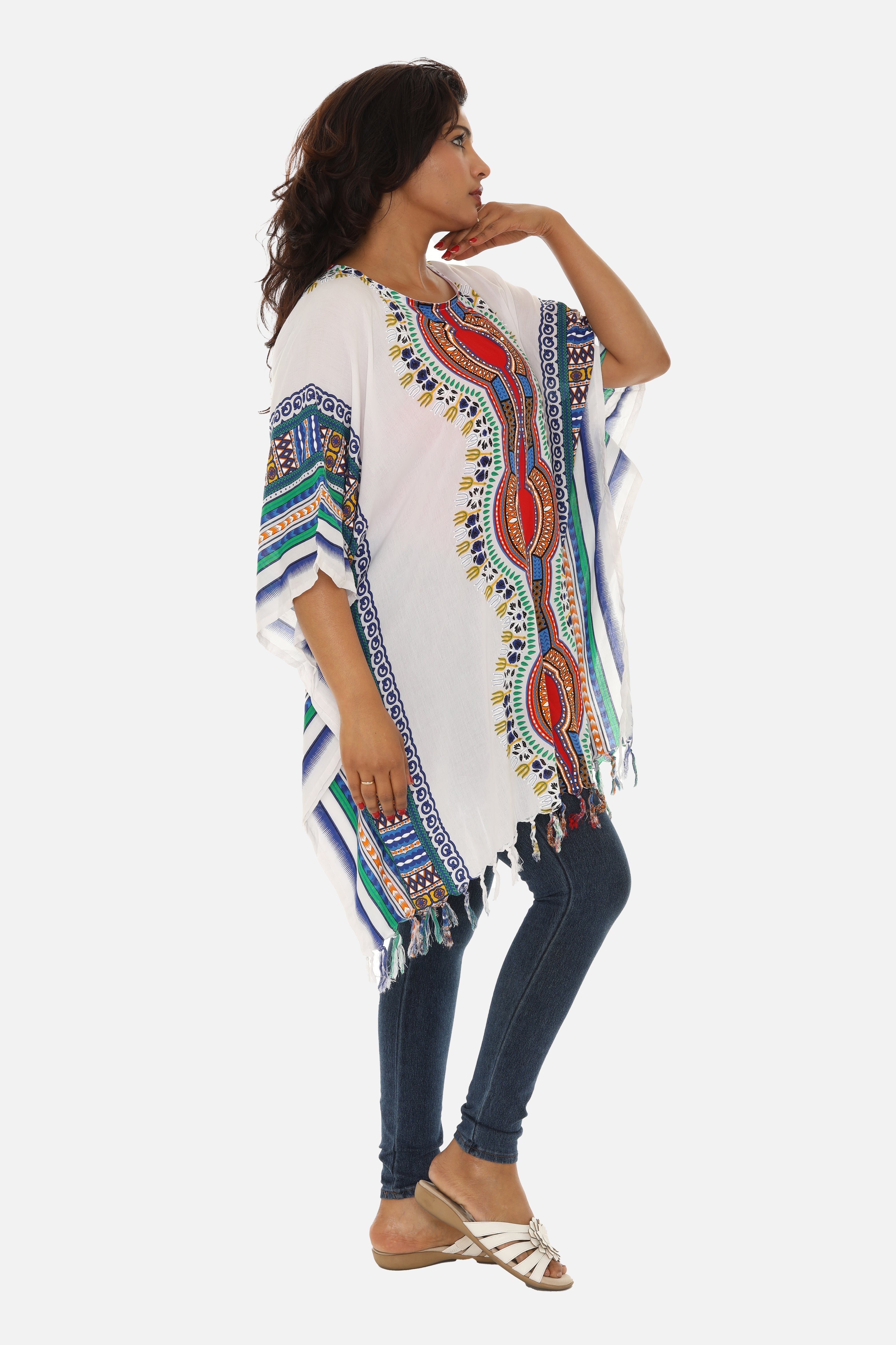 Bohemian Breeze: White Cotton Caftan with Multi-Colored Tribal Print and Tassels