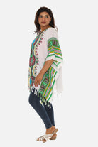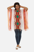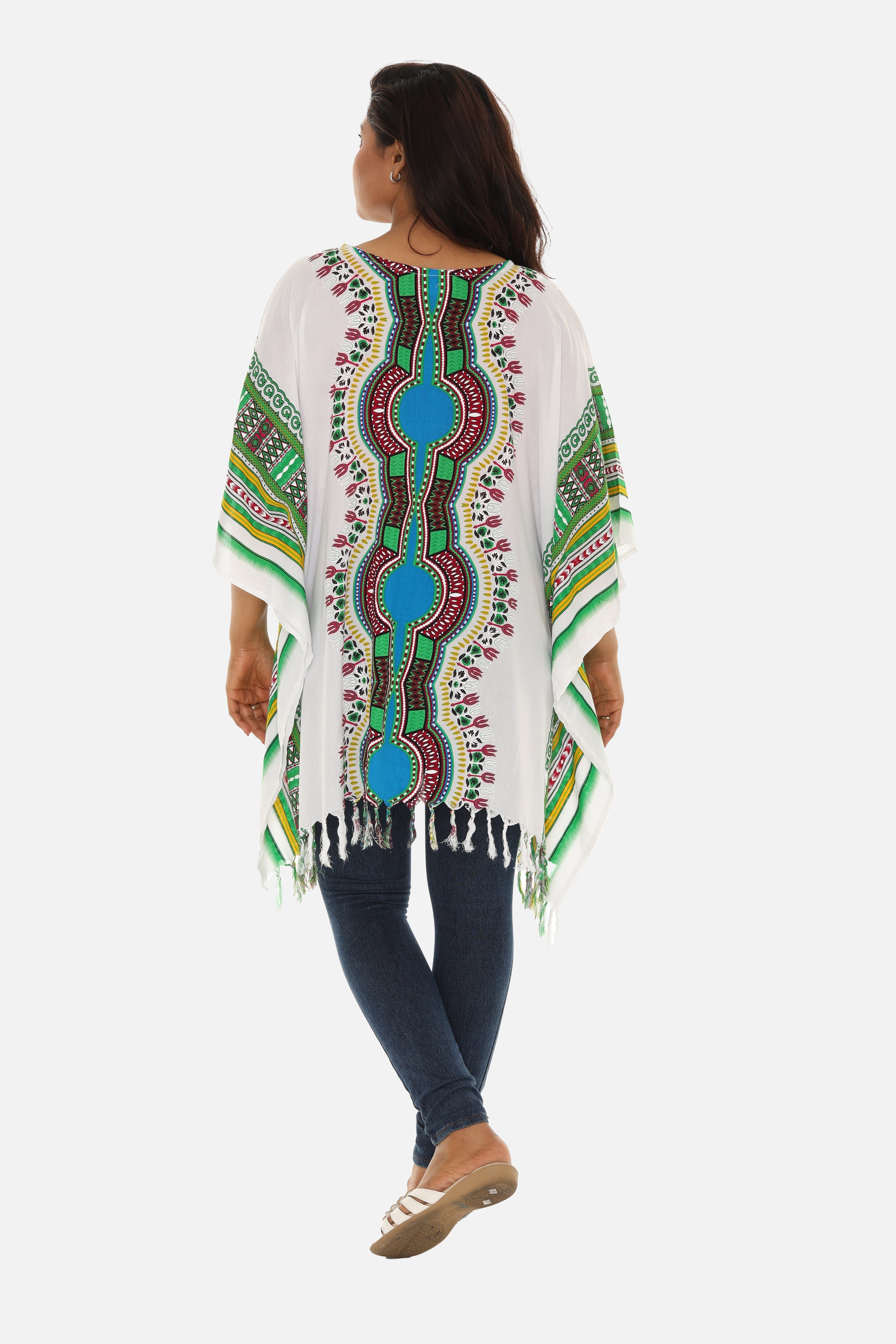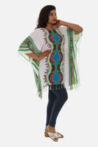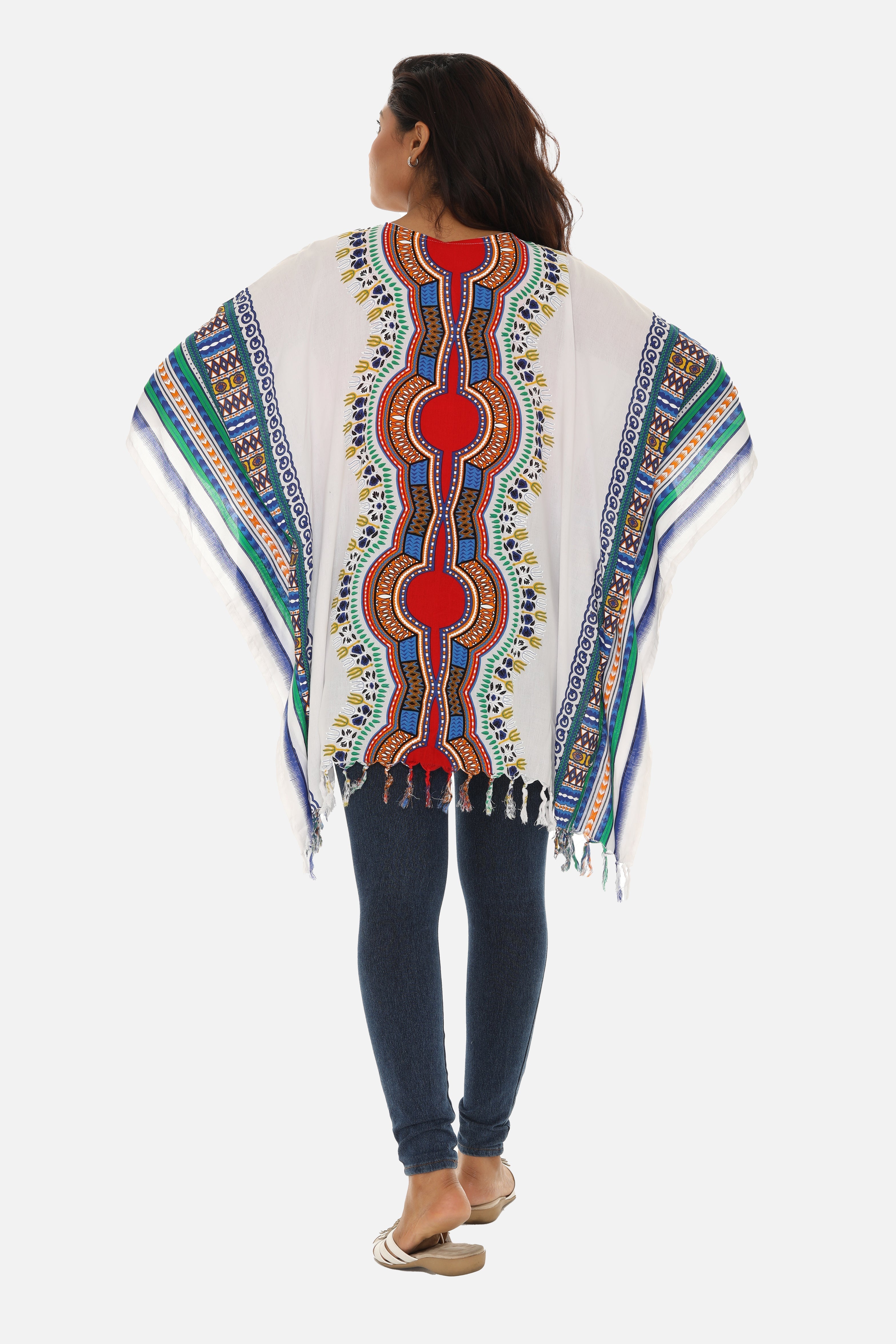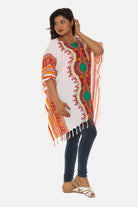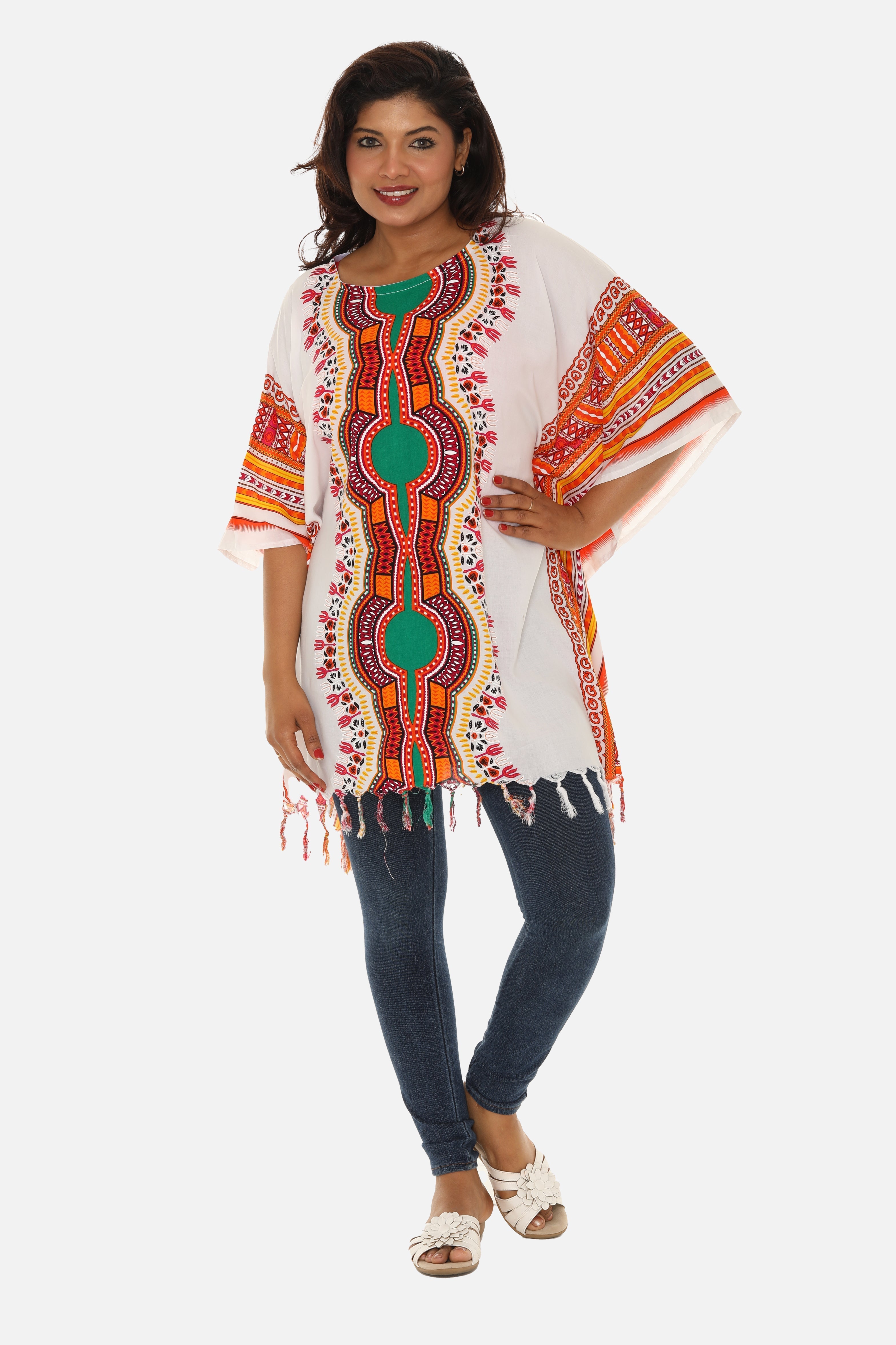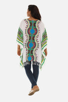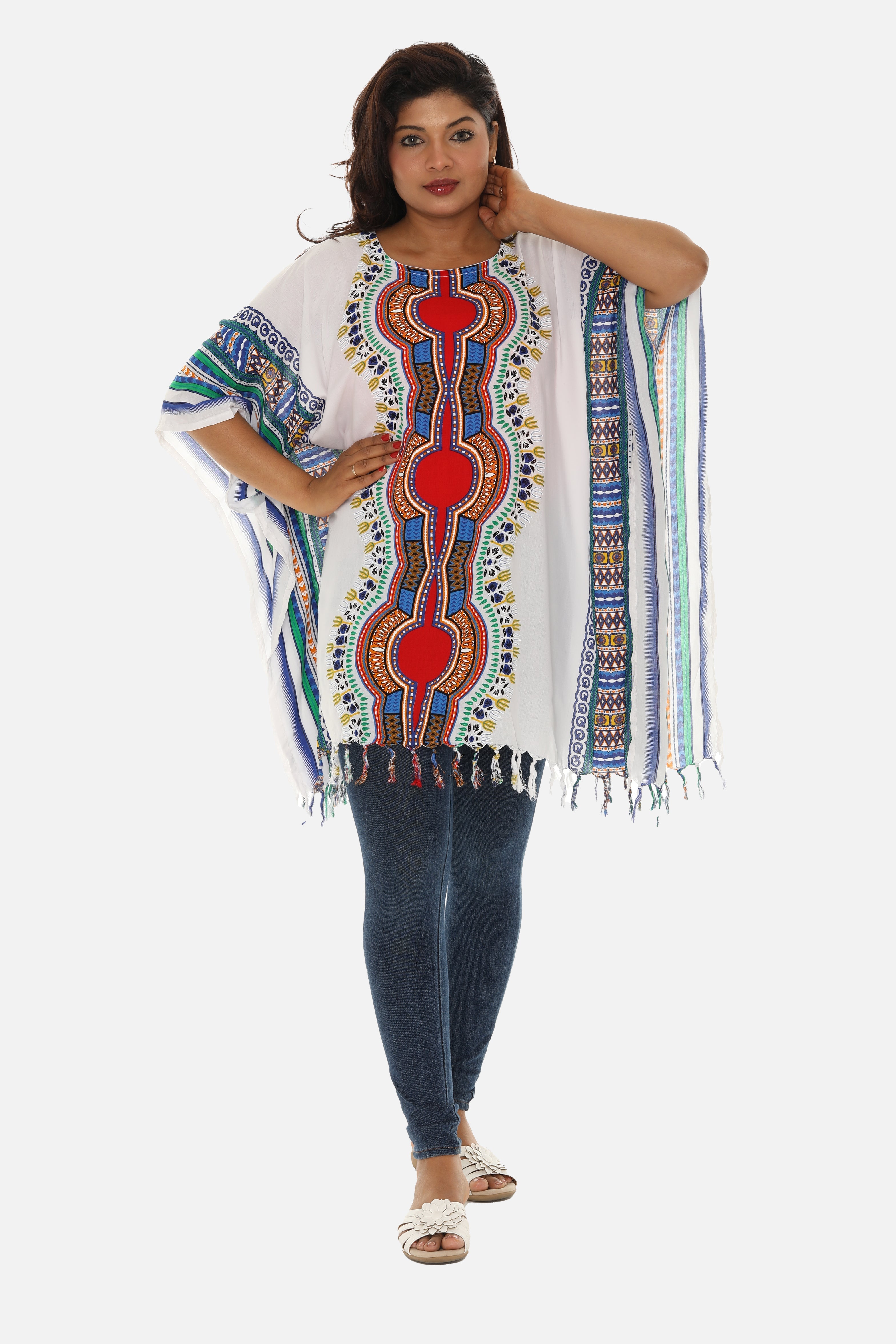 Bohemian Breeze: White Cotton Caftan with Multi-Colored Tribal Print and Tassels