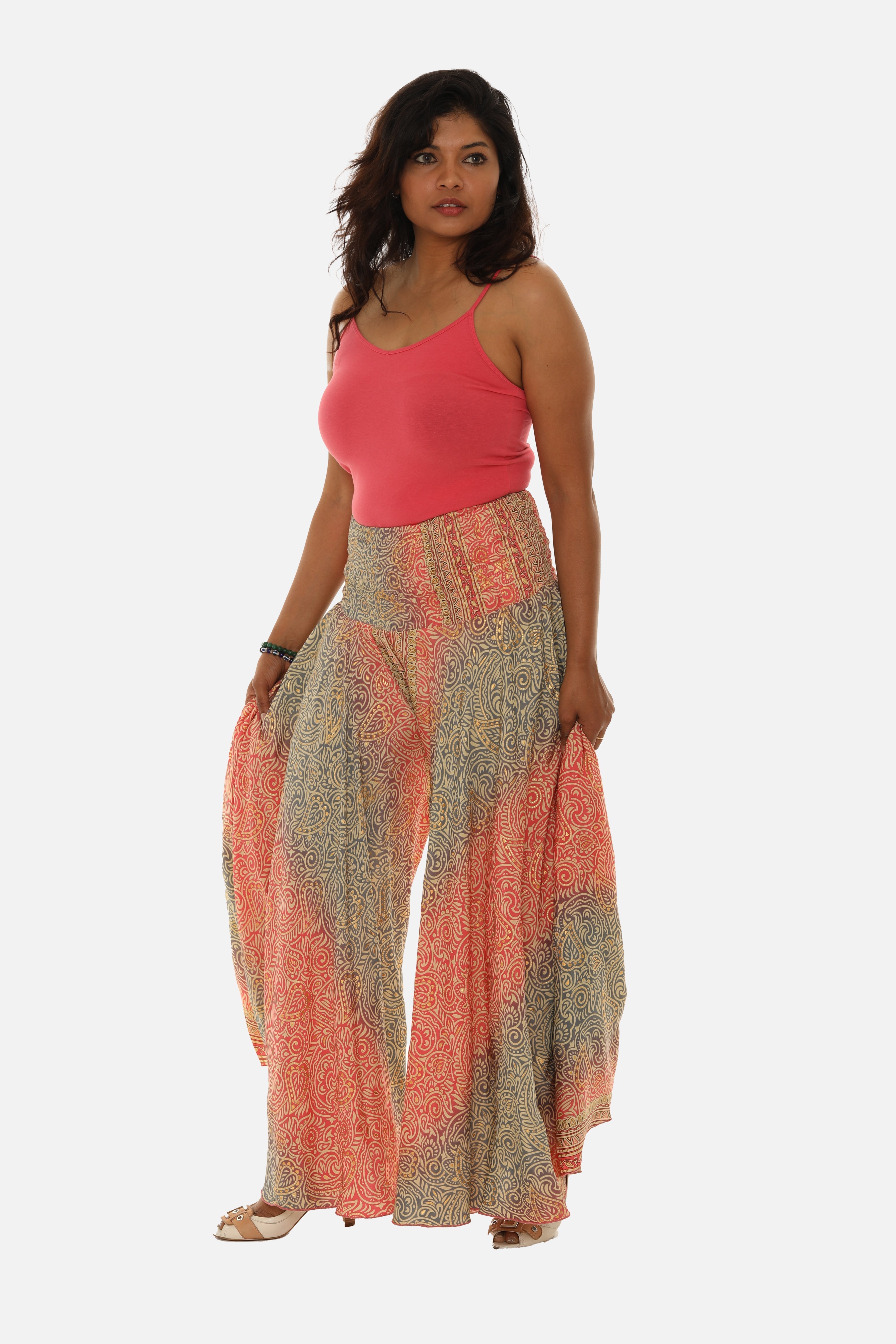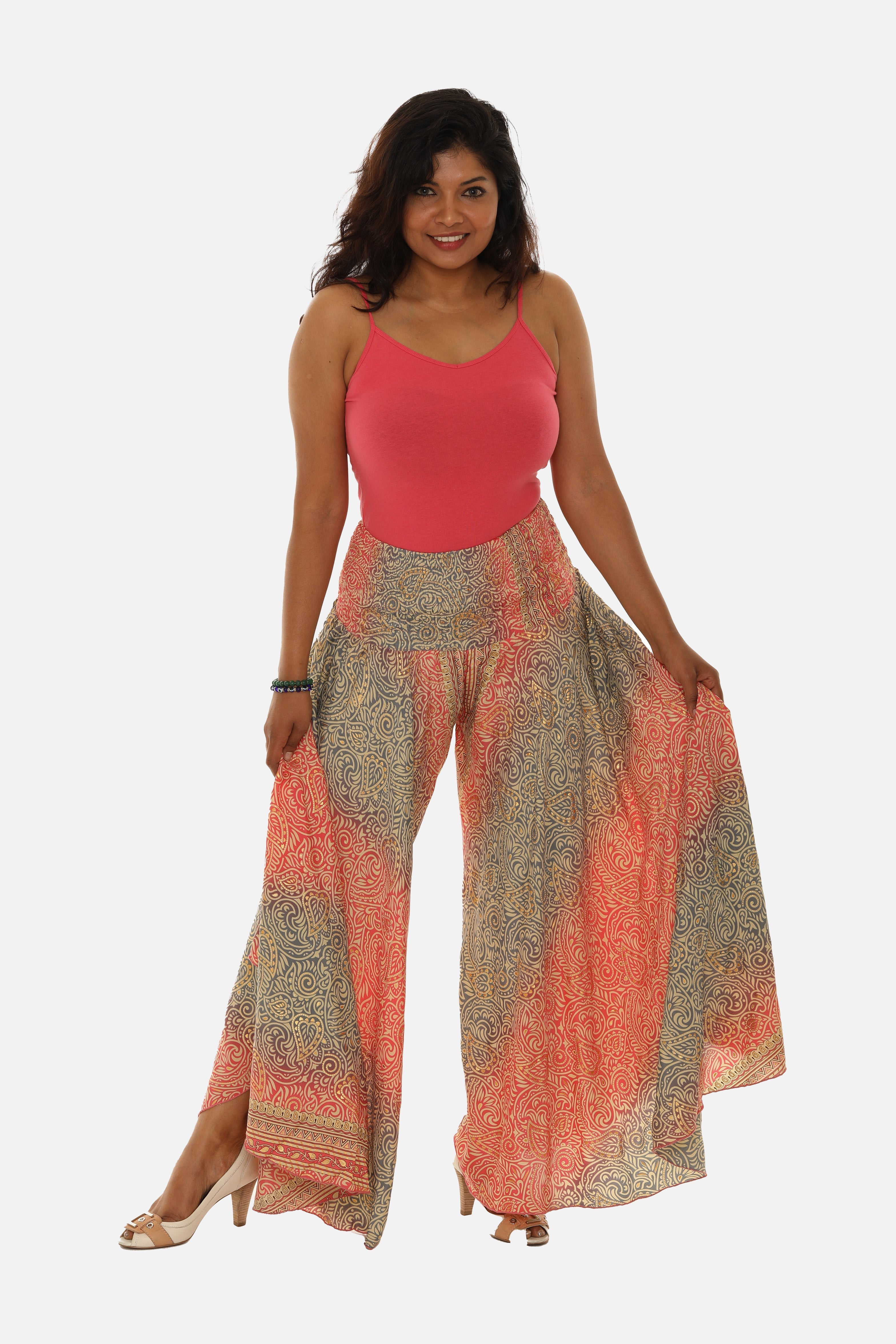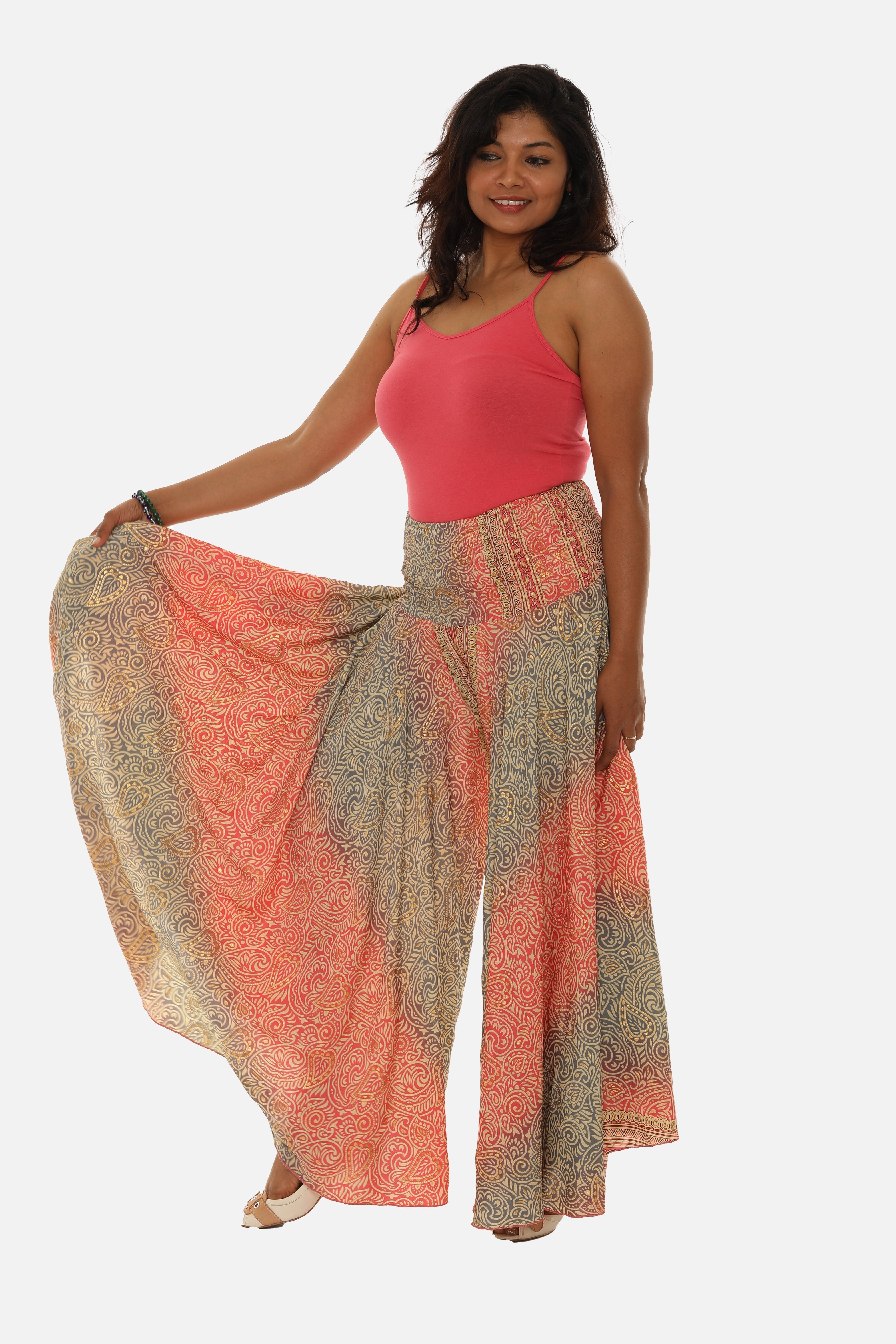 These wide-leg pants are just as stunning as the lovely sun as it sets in the west. Vivid color tones and distinctive patterns are extremely skillfully done. They have a broad waistband that helps to completely control and shape you.