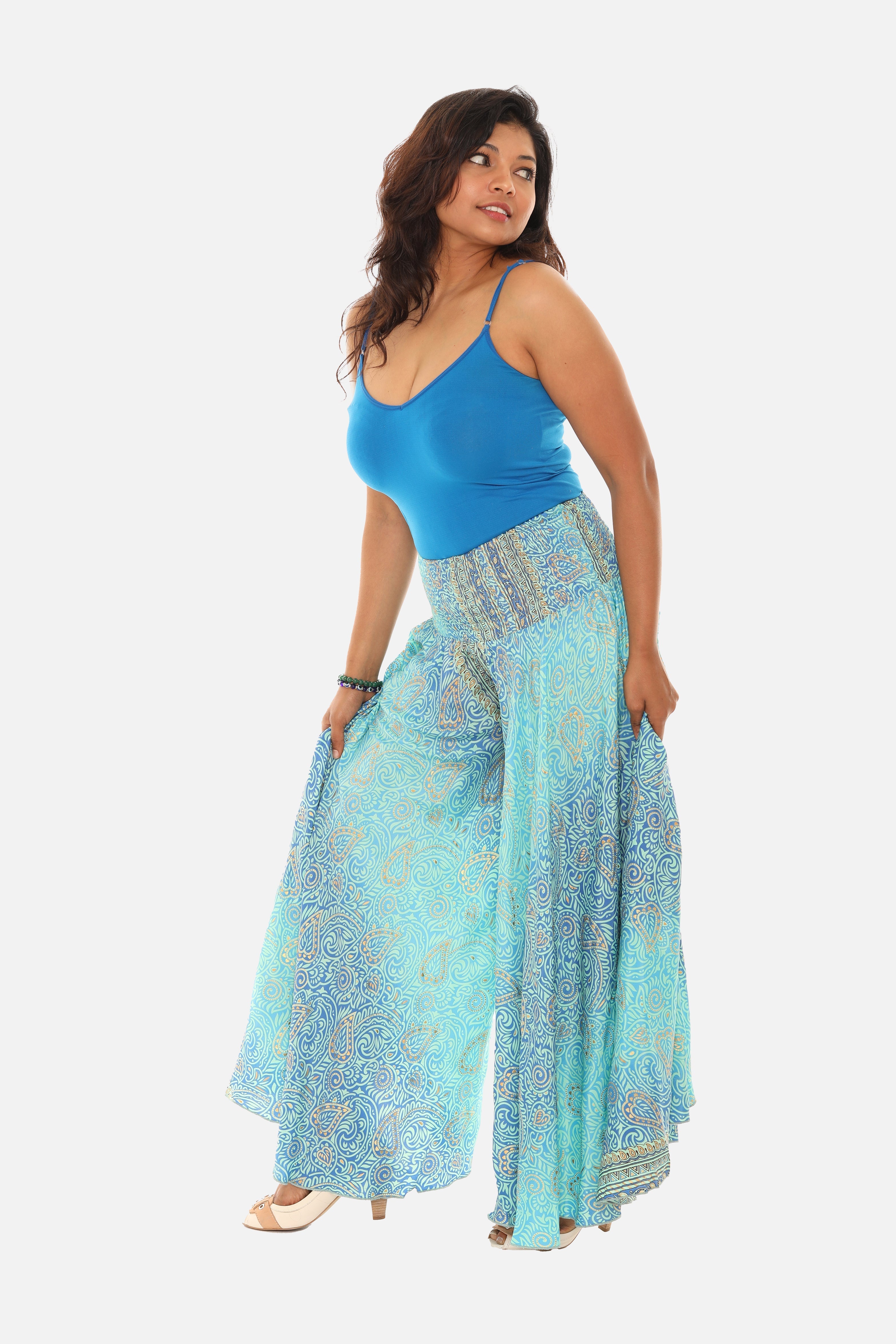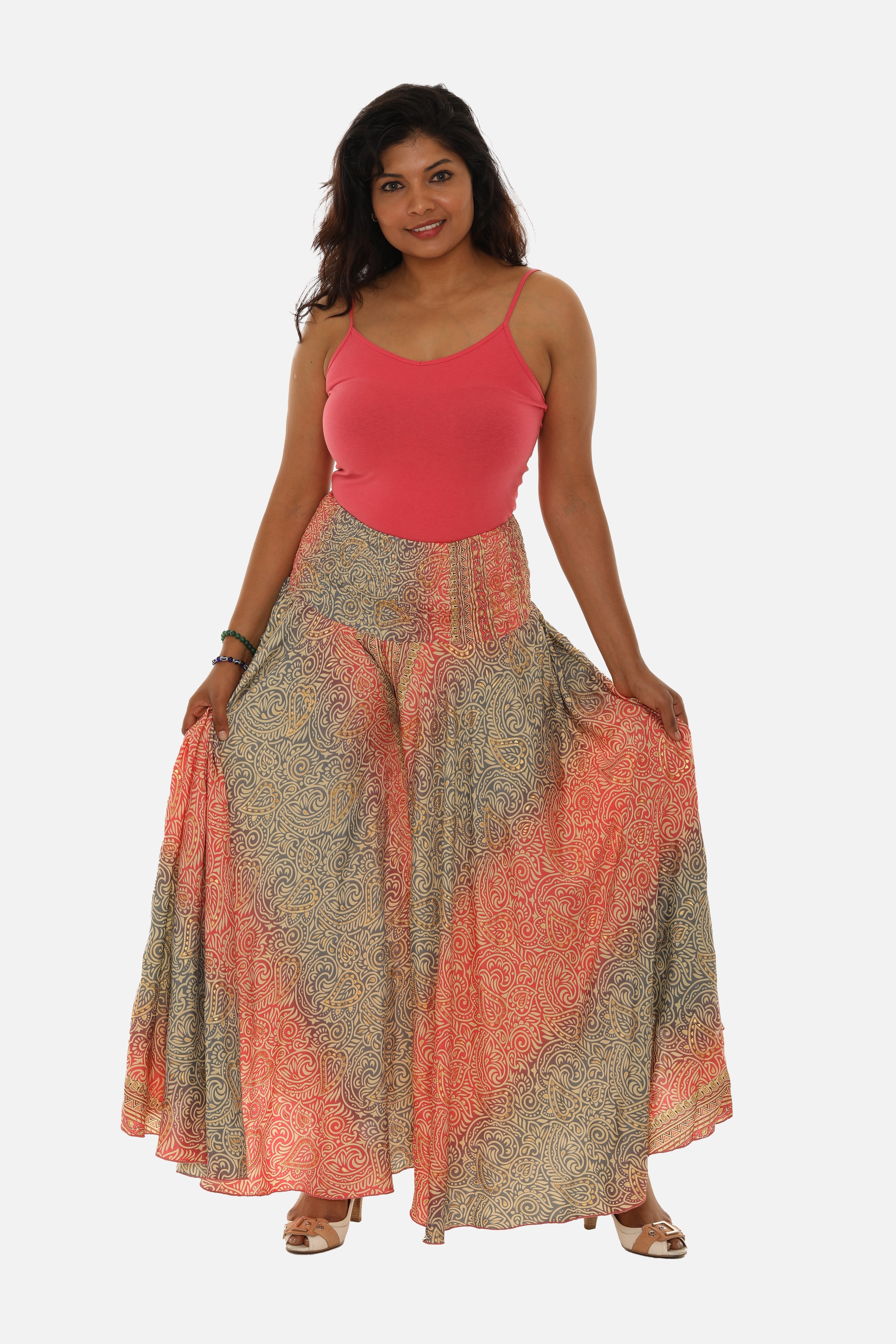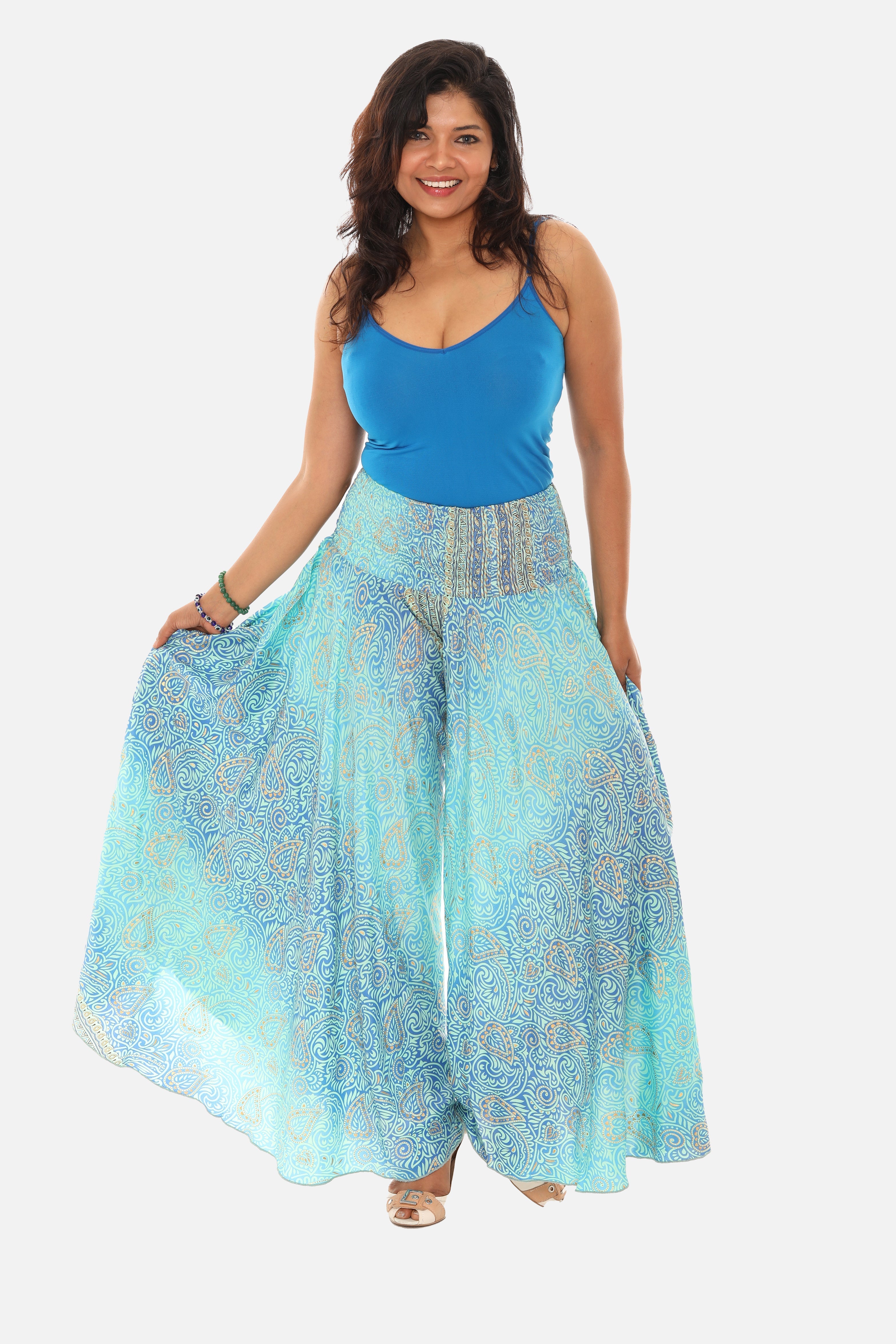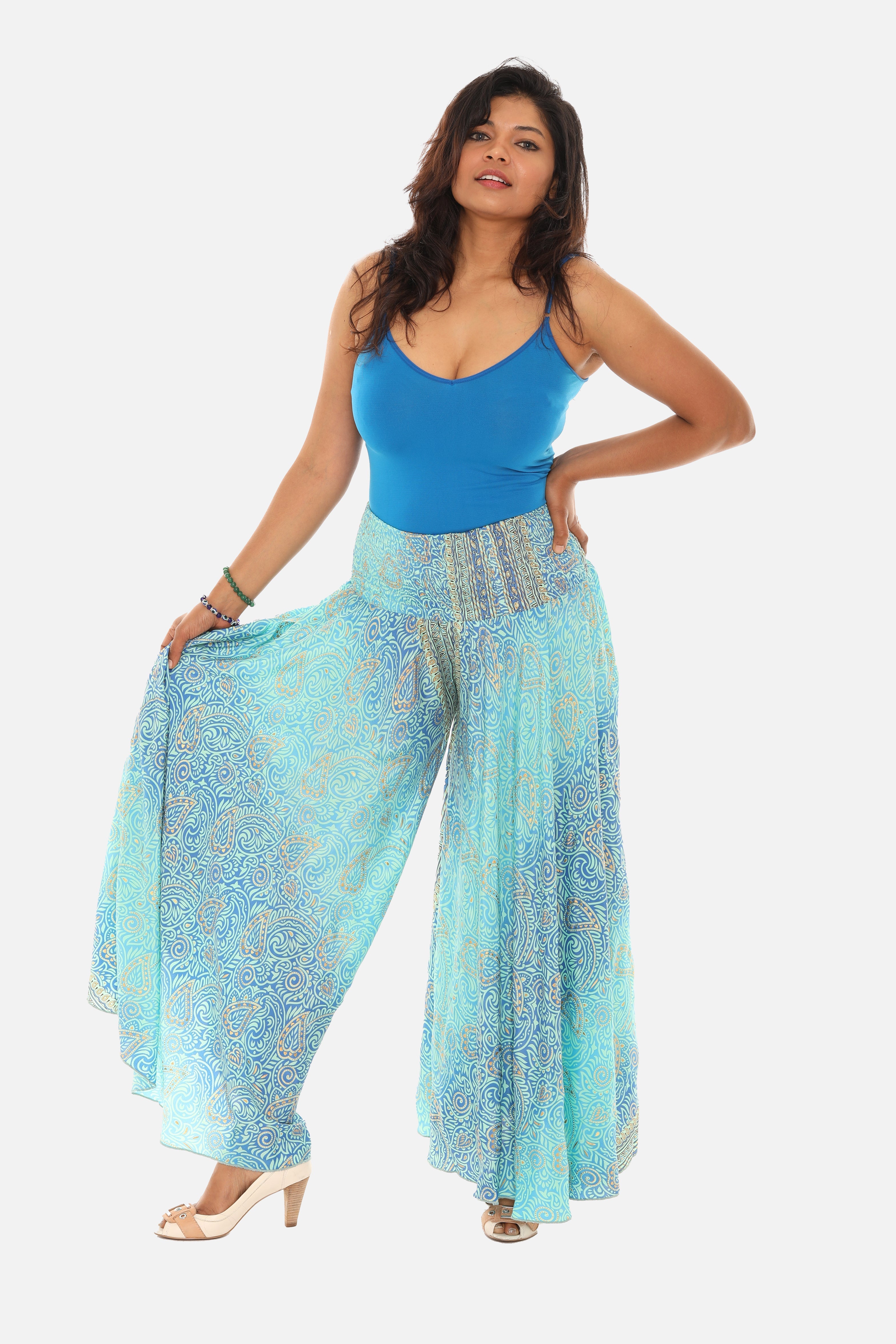 These wide-leg pants are just as stunning as the lovely sun as it sets in the west. Vivid color tones and distinctive patterns are extremely skillfully done. They have a broad waistband that helps to completely control and shape you.