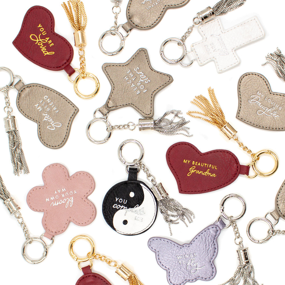 Designed specifically for the loved ones in your life, these vegan leather charms are embossed with silver, white or gold phrases. They include keychain hardware to attach to your purse or luggage, plus they include a complimentary metal tassel! Perfect as gifts or to personalize your own bag.