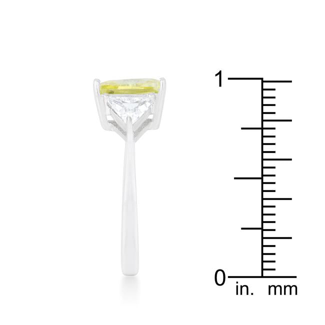 A pair of clear trillion cut stones accompany a peridot radiant cut center stone in this elegant 4.5ct CZ engagement ring. A modern twist on a classic piece. Our genuine rhodium finish is achieved using an electroplating process that coats the item with heavy layers of rhodium a close cousin to platinum. This gives our jewelry a platinum luster.
