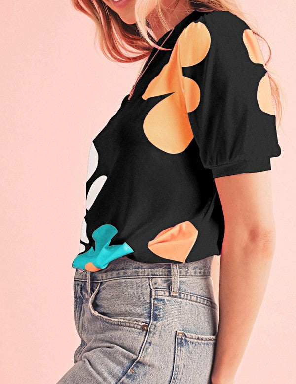 Colorful Flower Print Bubble Sleeve Tee Top