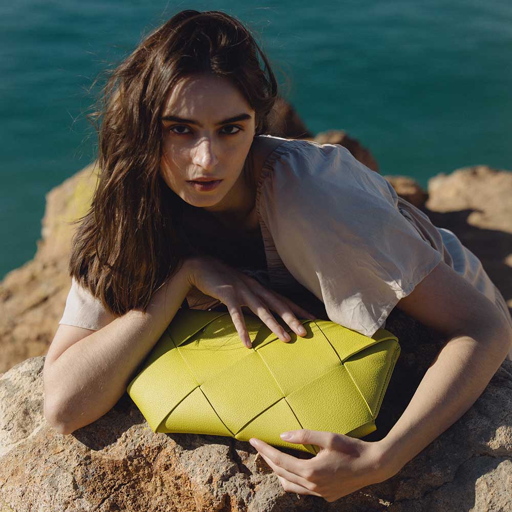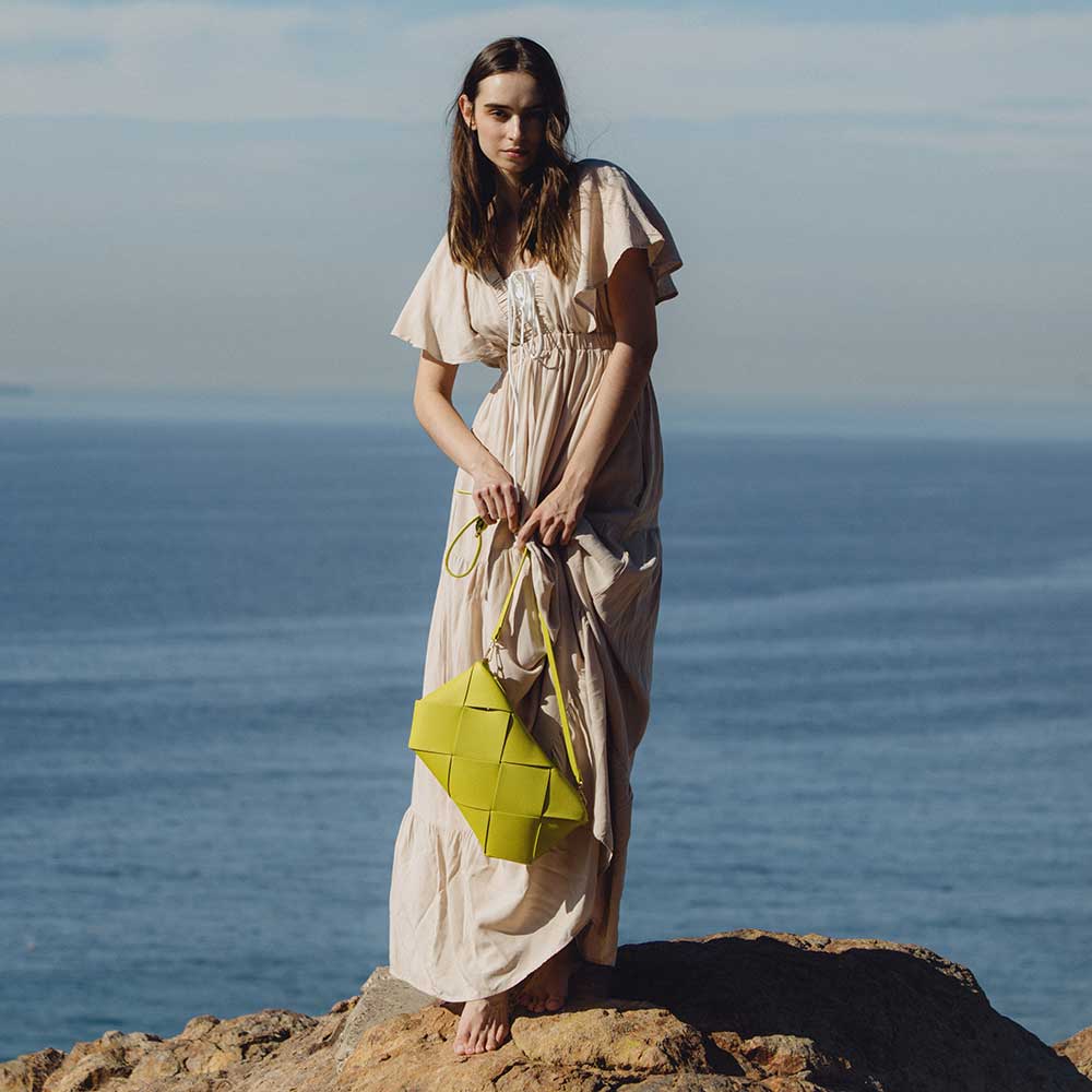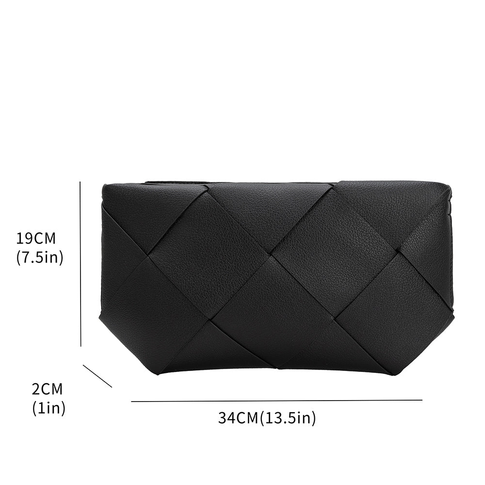 The Connie is the perfect sophisticated crossbody bag to add to your collection. Made with recycled vegan leather and handcrafted to perfection with its wide strip woven exterior look. Carry by hand or attach the crossbody strap.