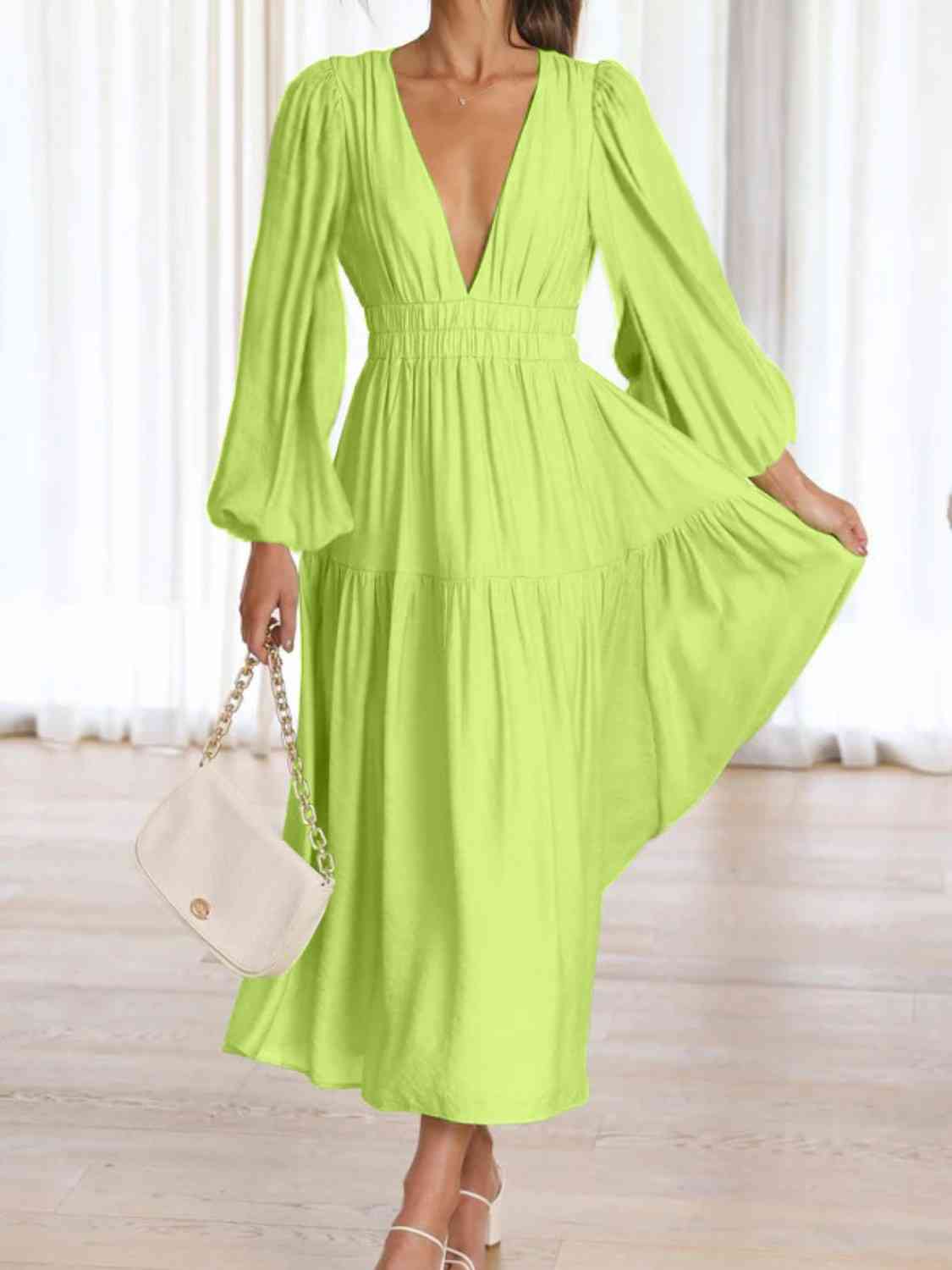 Deep V-Neck Balloon Sleeve Plain Maxi Dress