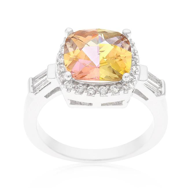 Elles Ring is a fun cocktail style ring to wear out on the town. Its multicolor faceted center zircon radiates while the pave cubic zirconia clusters brighten and make this ring pop. Genuine Rhodium Plating is achieved using an electroplating process that coats the item with heavy layers of rhodium a close cousin to platinum which gives our jewelry a platinum luster.