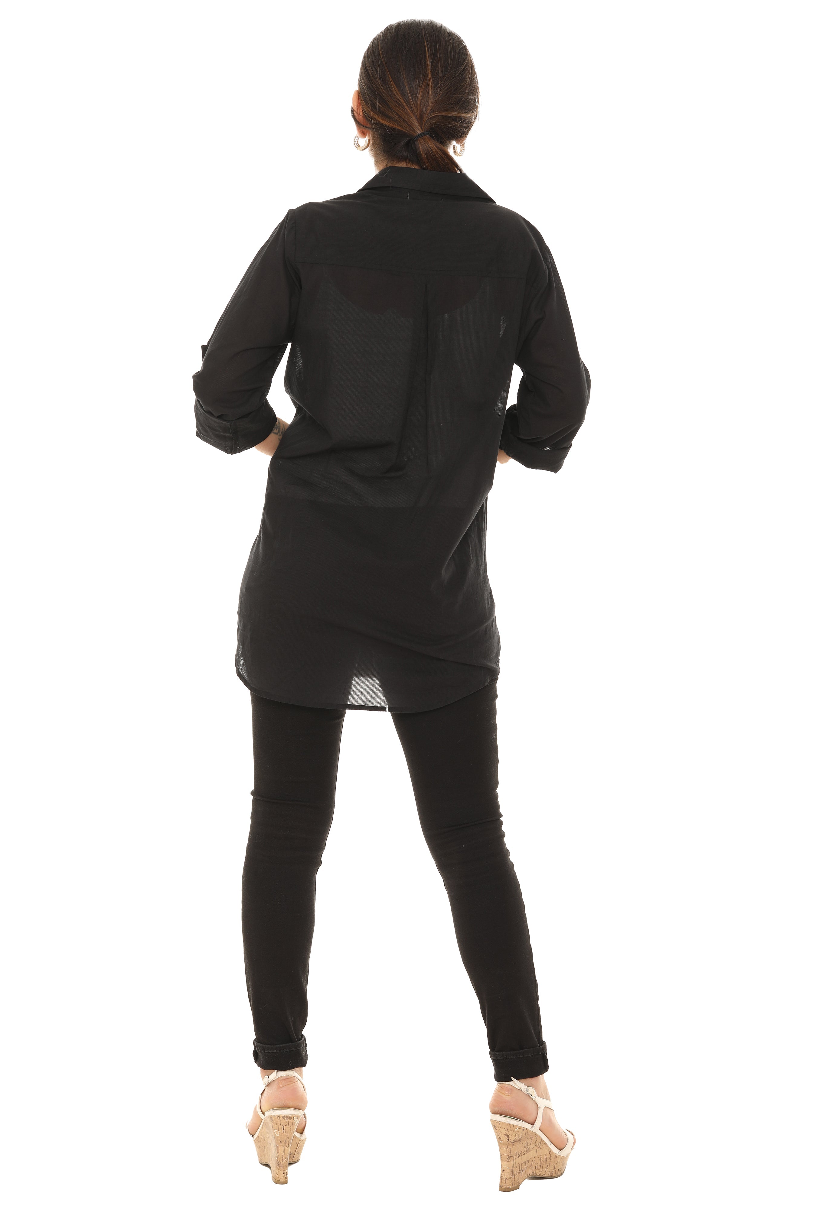 Find Indian-inspired style in this long-sleeve top that has detailed embroidery and buttons at the top.