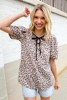 Step into spring with this whimsical yet bold animal print knit top featuring a notched front tie design and short sleeves. This stunning top can be tucked in or tucked out.