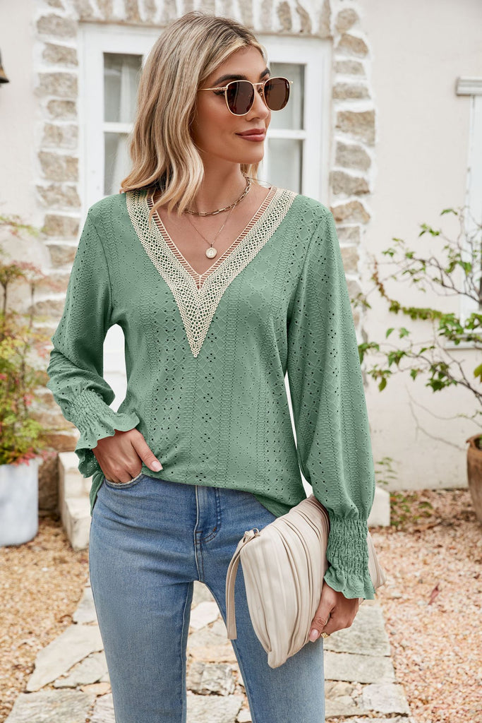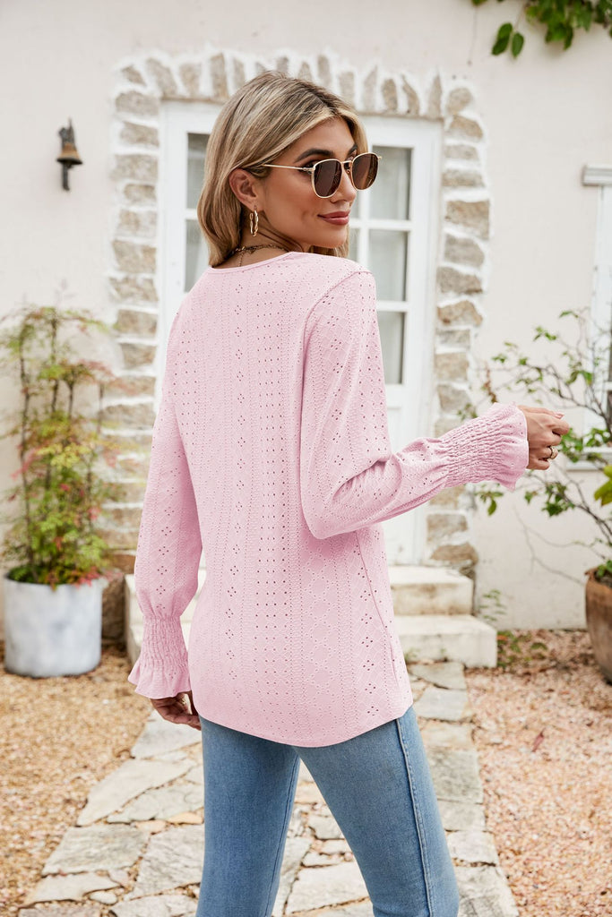 Eyelet V-Neck Smocked Flounce Sleeve Blouse