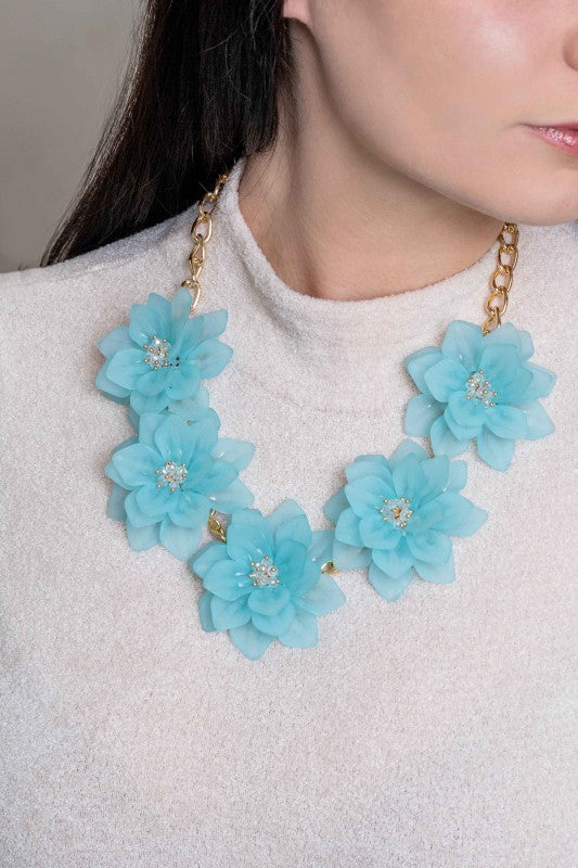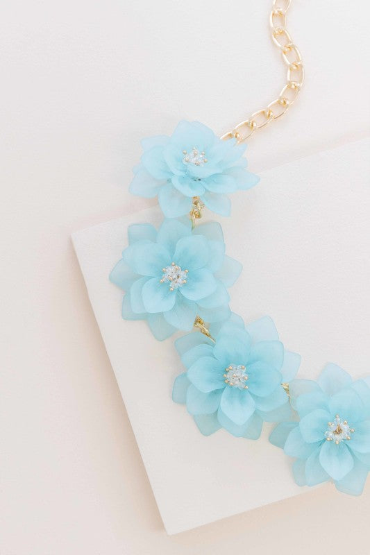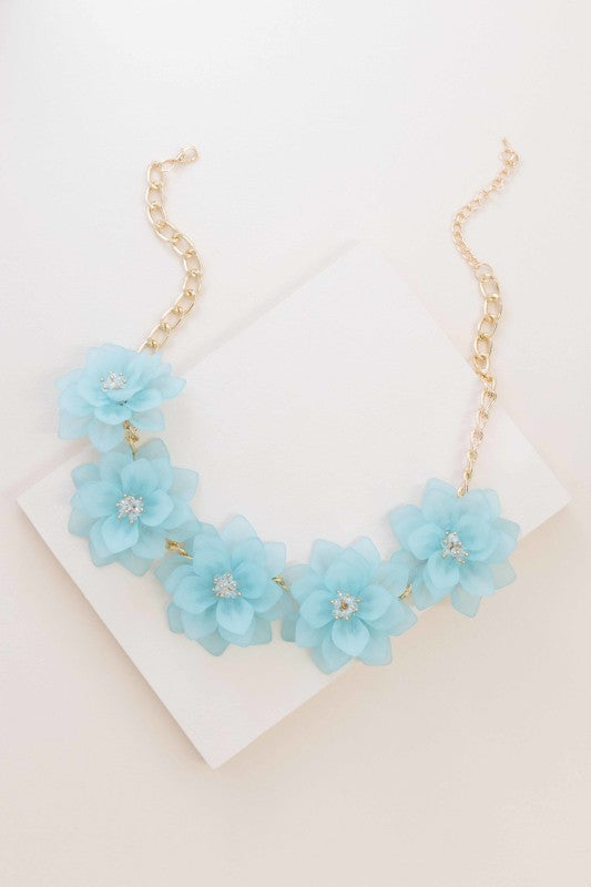 A beautiful clear blue floral statement necklace, with crystal clear and gold accents in the middle. Perfect for work or a night out!