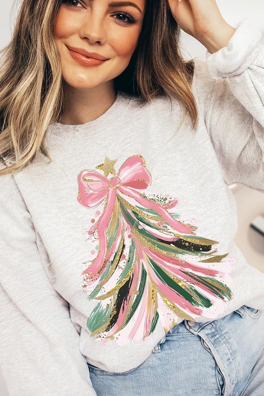 Faux Glitter Pink Bow Christmas Tree Graphic Fleece Sweatshirts.