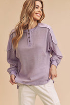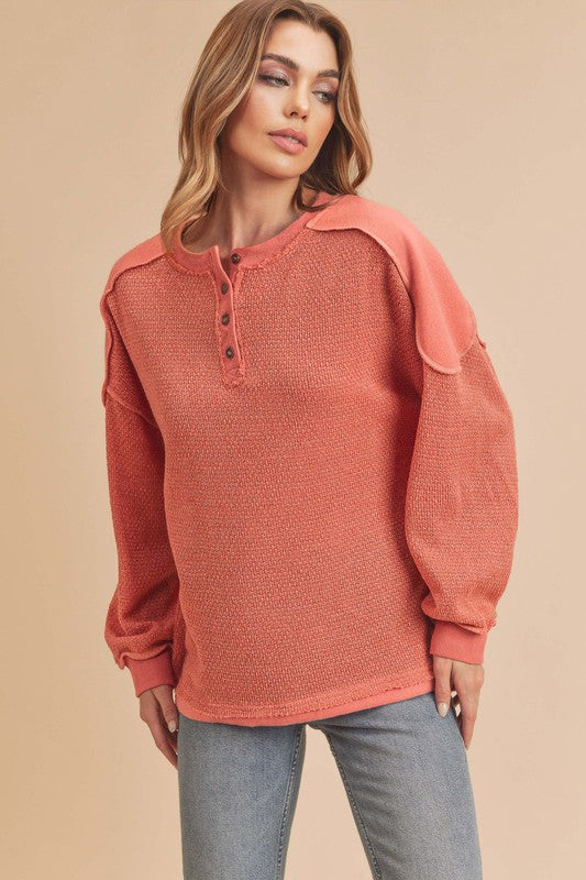 Felicity Top conveys a laid-back vibe and shows the stylish paneled design. She cuts to an oversized silhouette, contrast shoulder, and raw detailing throughout.