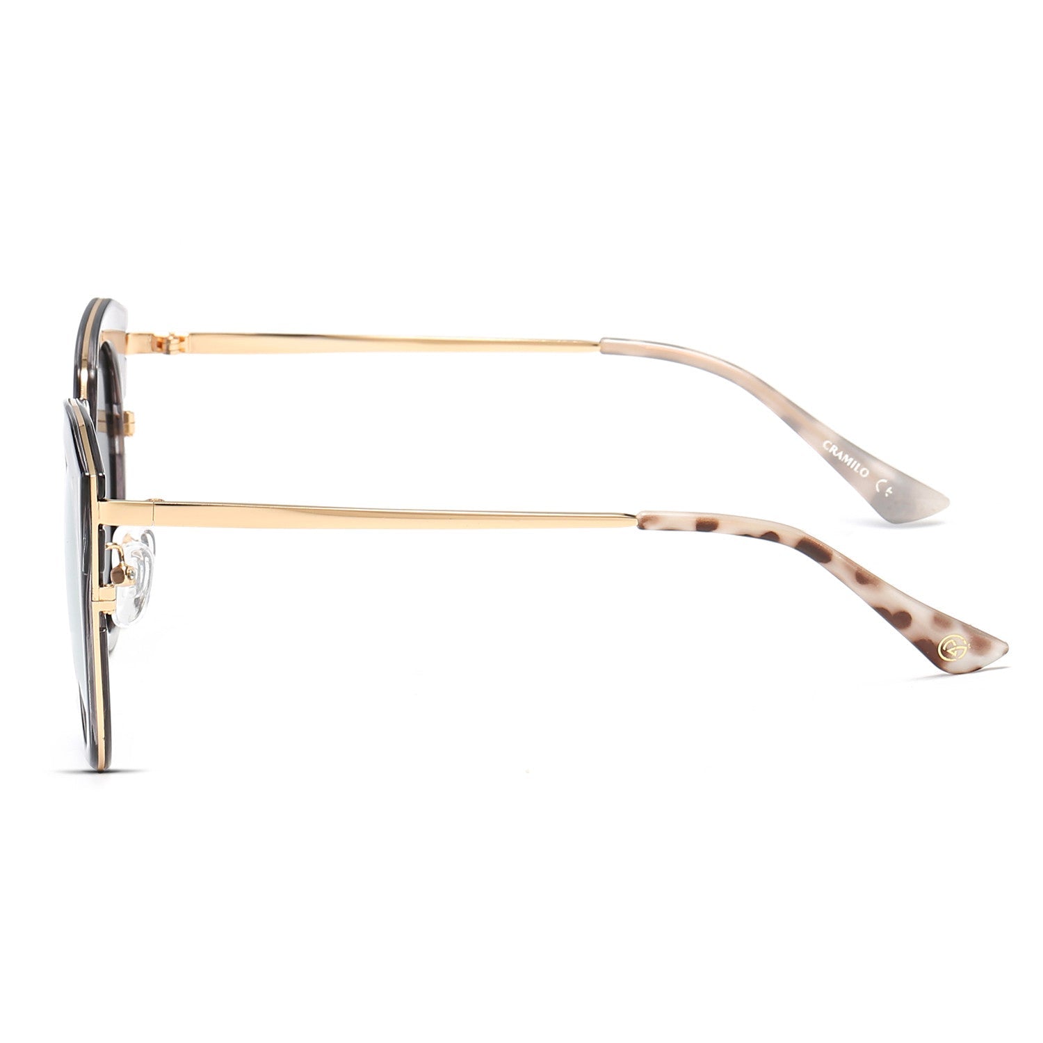 A fabulous oversized cat eye design with the choice of bold or translucent rims make these sunnies a great fit for all facial shapes and personal styles. Note how the rims transition stylishly from the jagged upper half to the smooth round curve of the bottom half. The lenses are polarized, offering maximum eye protection and comfort while outdoors.