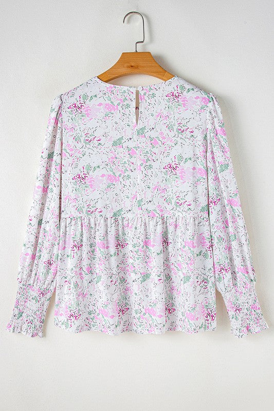 Floral Balloon Sleeve Keyhole Back Babydoll Blouse