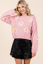regular size, standard, contemporary, young contemporary, floral, flower, embroidered, embroidery, lightweight, knit, sweater, top, long sleeves, ribbed round neck, ribbed cuffs and at the bottom, cute, stylish, fashionable, trendy, comfortable, daily wear, women's clothing, women's apparel, women's wear, transitional, fall, winter, spring, summer, fw, ss