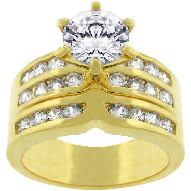 This ring is an absolute classic and it looks absolutely fabulous. The center stone is 1.35 carat simulated size set on rhodium prongs. The side shoulders boast another .95 carats worth of stones to make a 2.3 total carat weight cubic zirconia ring. We also have a silver tone version available. 18k plated gold is achieved using an electroplating process that coats the item with heavy layers of 18k Yellow Gold and color-treated to display a perfect 14k Hamilton gold color.
