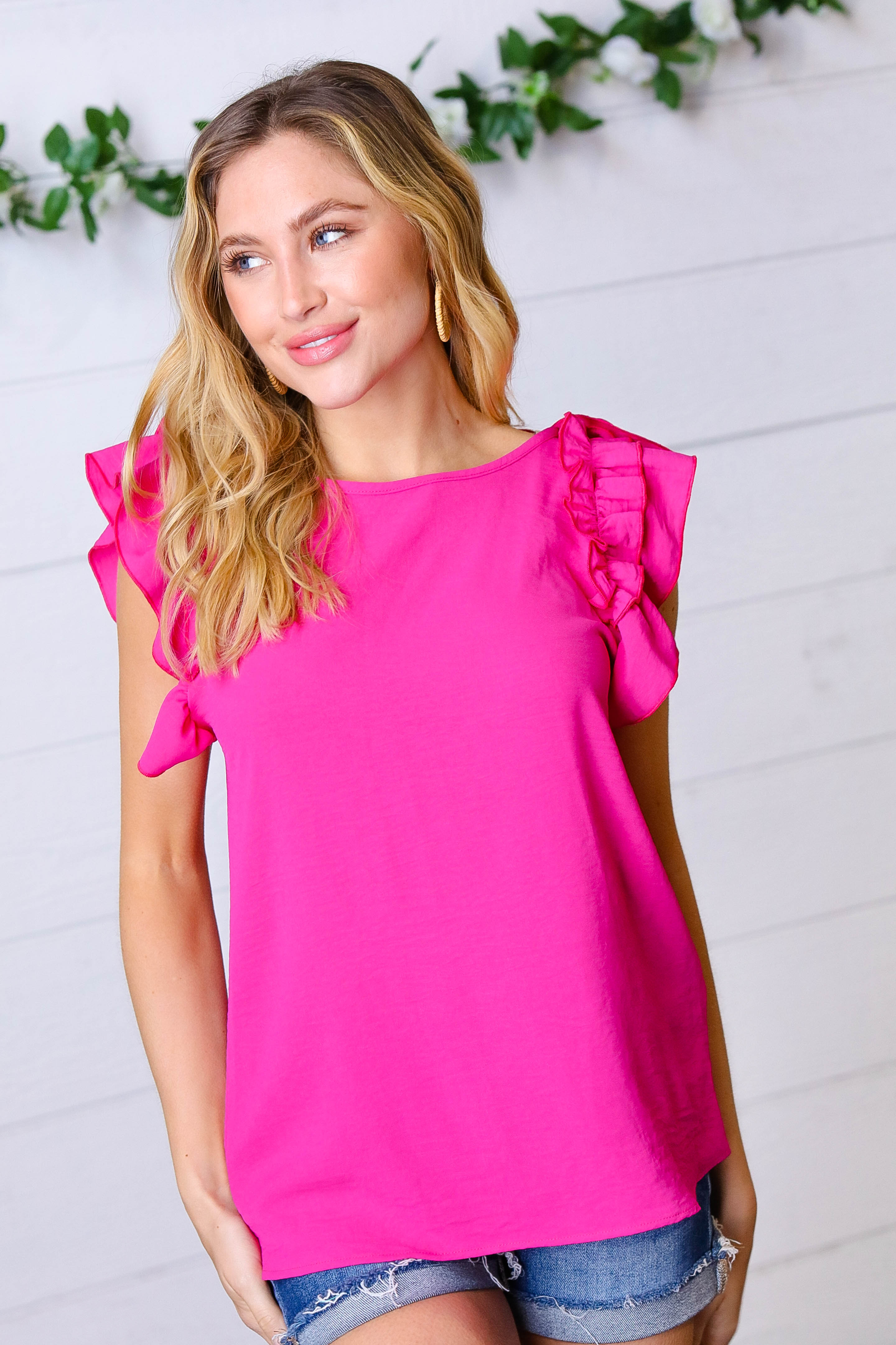 French Rose Double Ruffle Sleeve Crinkle Top