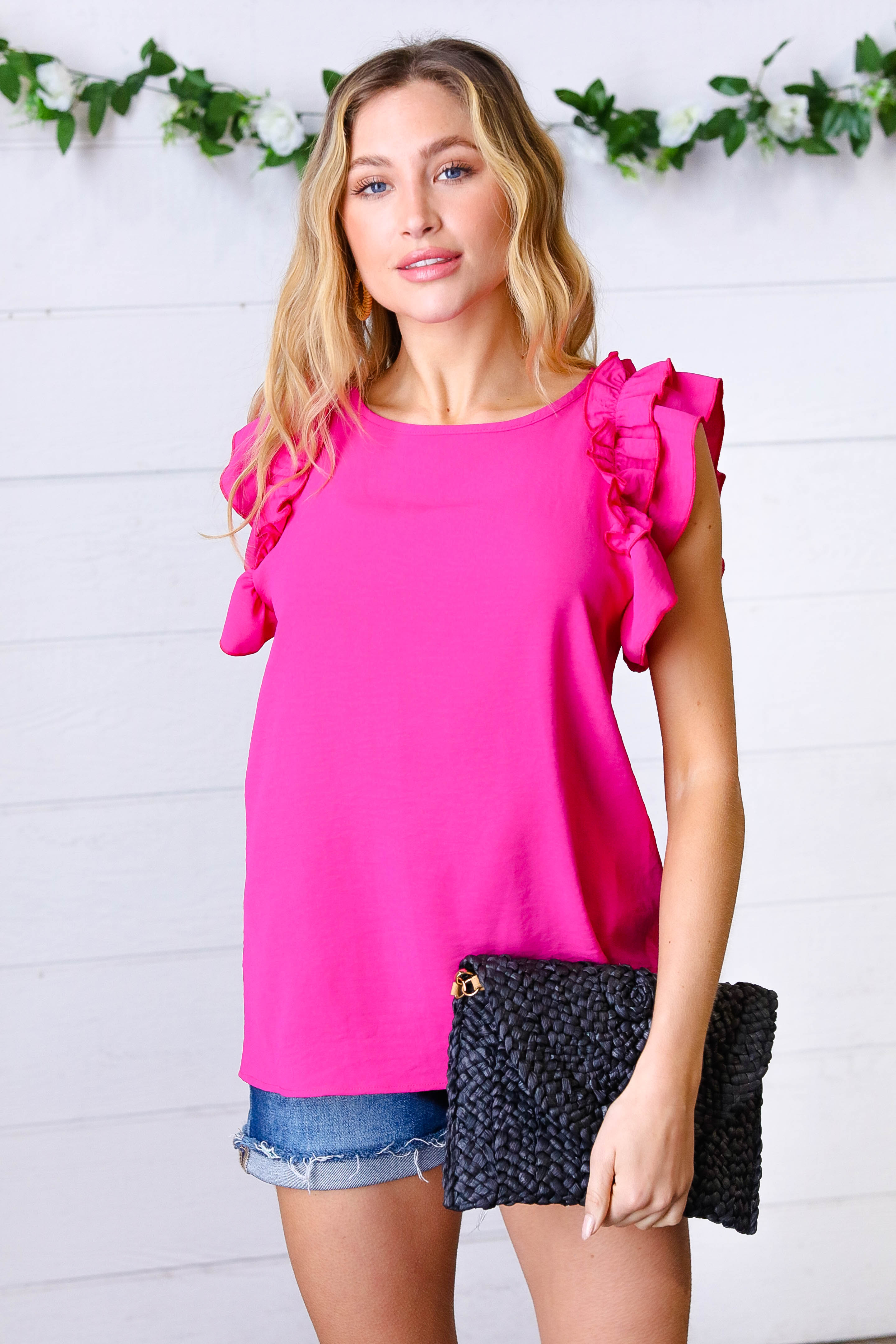 Get ready for date night in this double ruffle short sleeve top featuring a classic round neck. A back clasp keyhole and crinkle material complete this charming style.