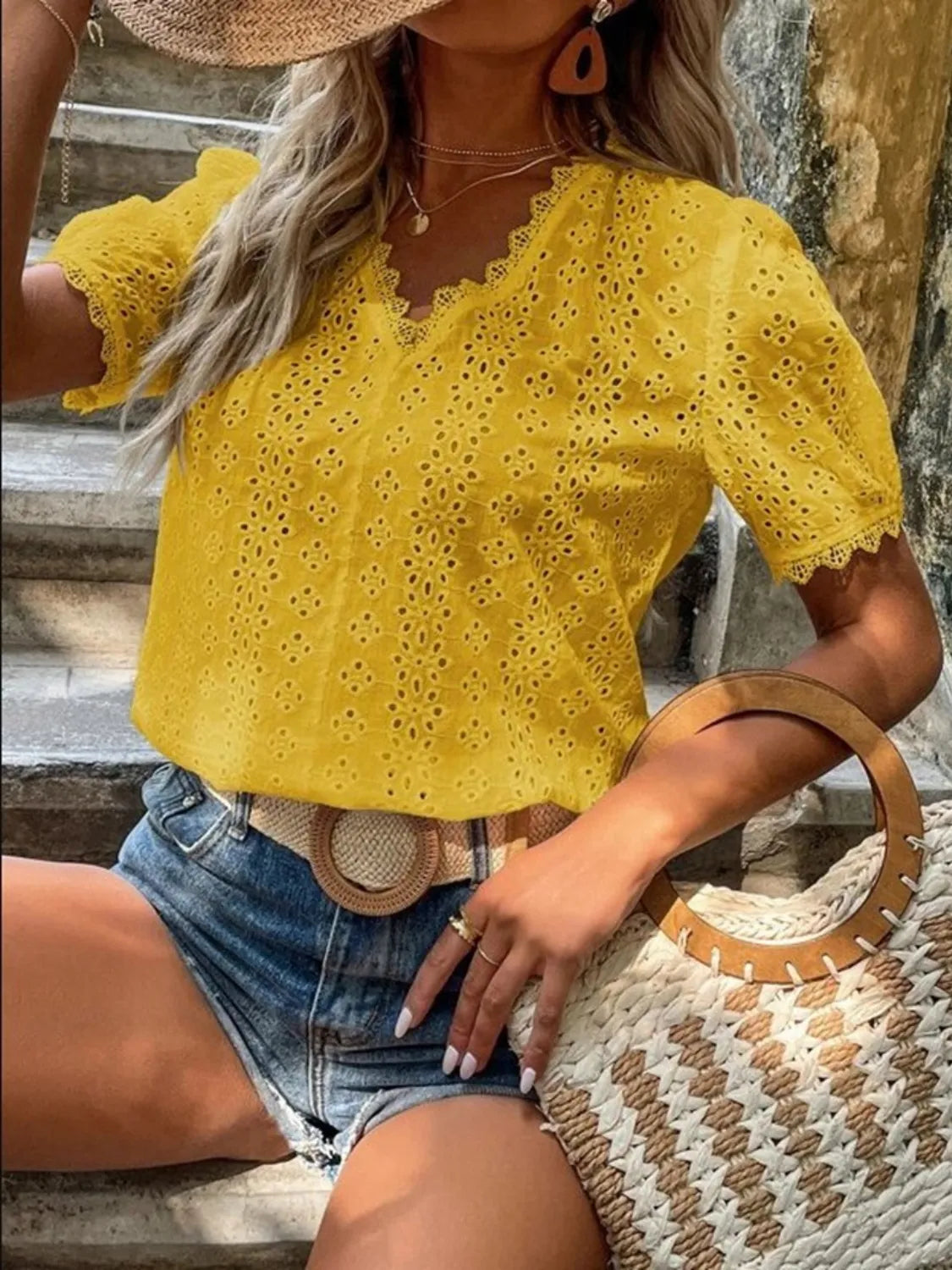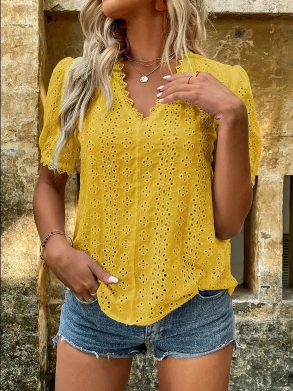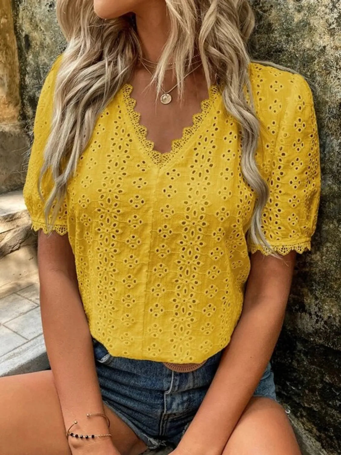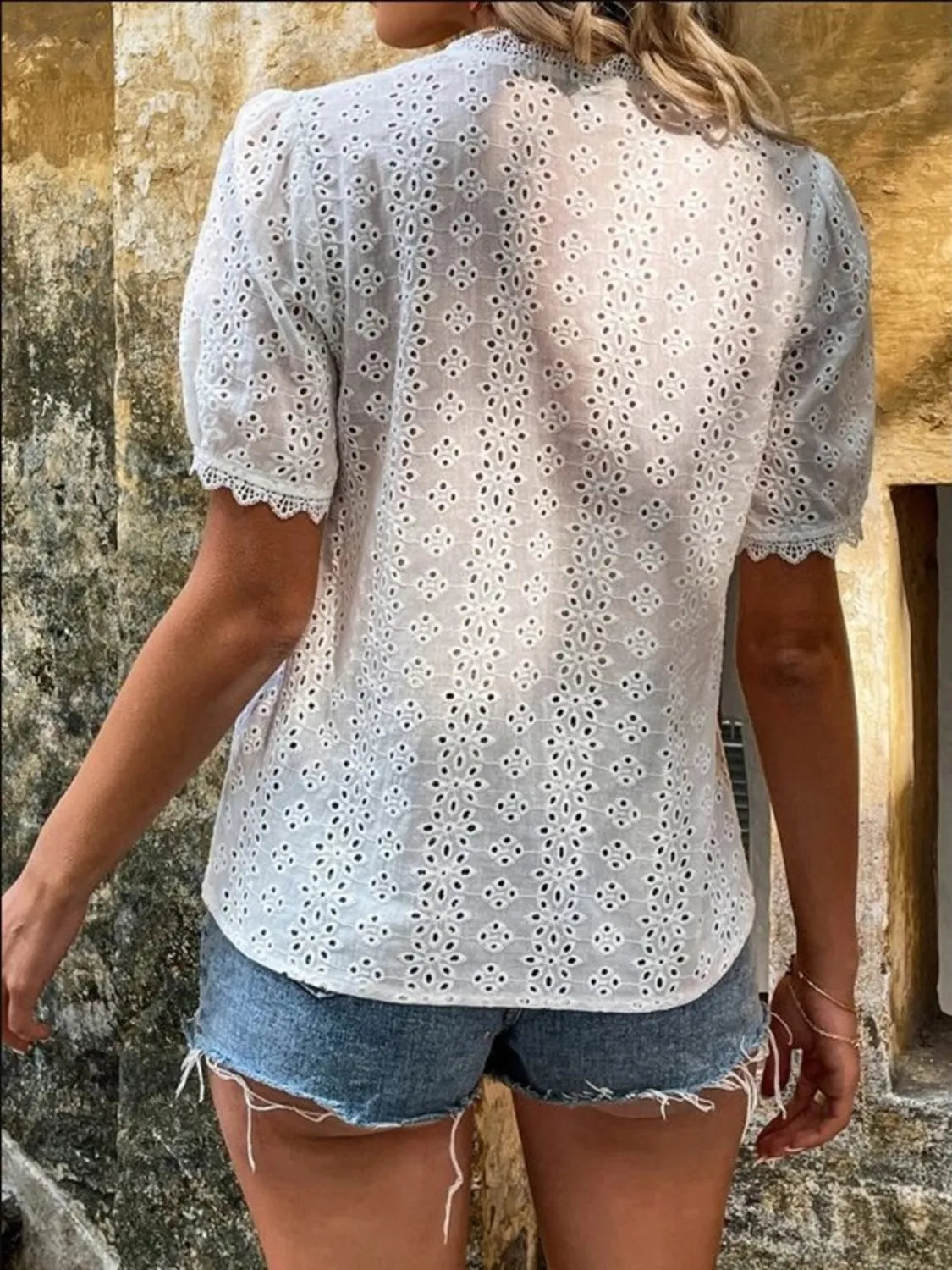 Full Size Lace Detail Eyelet V-Neck Short Sleeve Blouse Plus Size