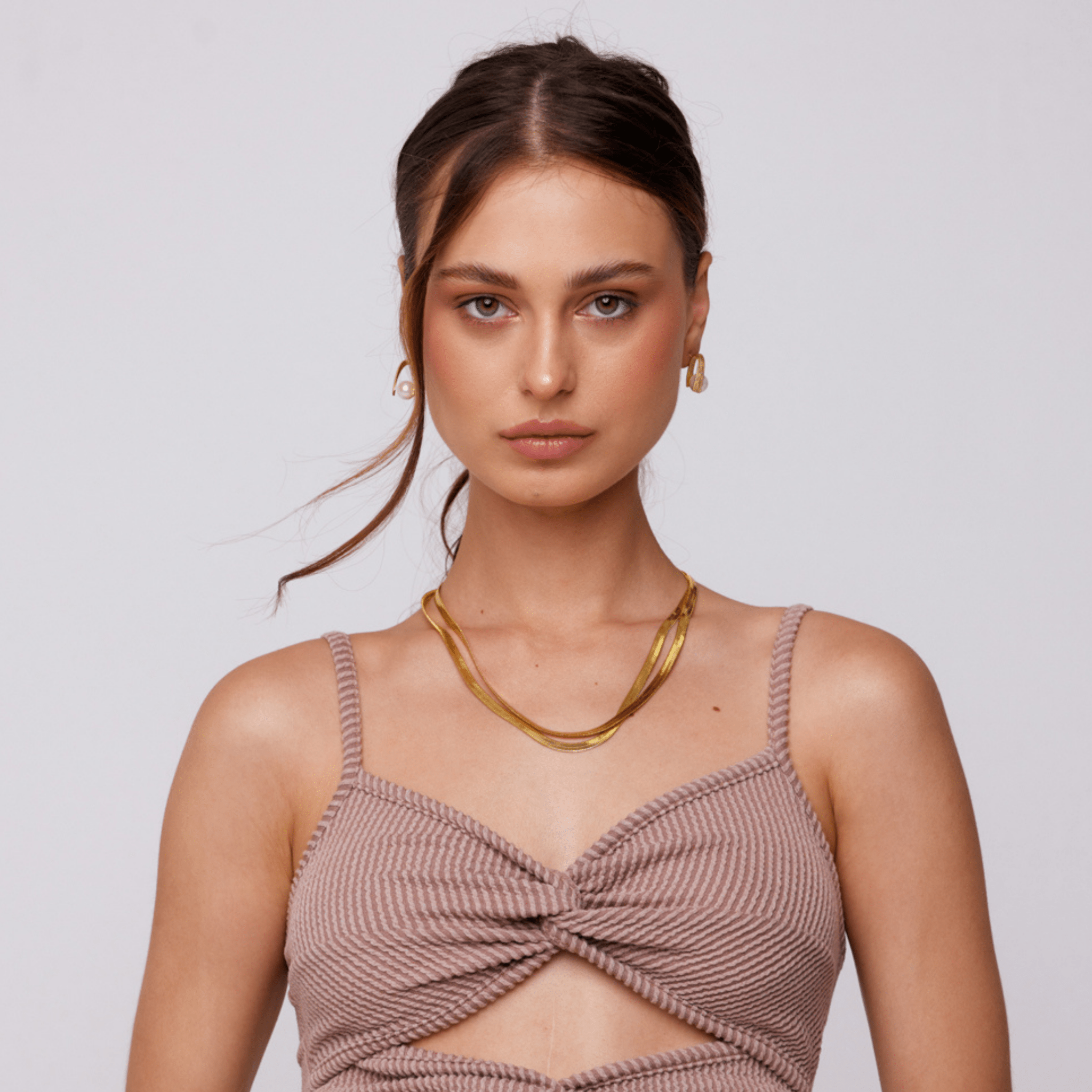This GABRIELA Necklace features a 17.3-inch length with a 2.75-inch extension, crafted from copper and finished with elegant 18K gold plating. Its versatile design offers both durability and a refined look, perfect for everyday wear or special occasions.