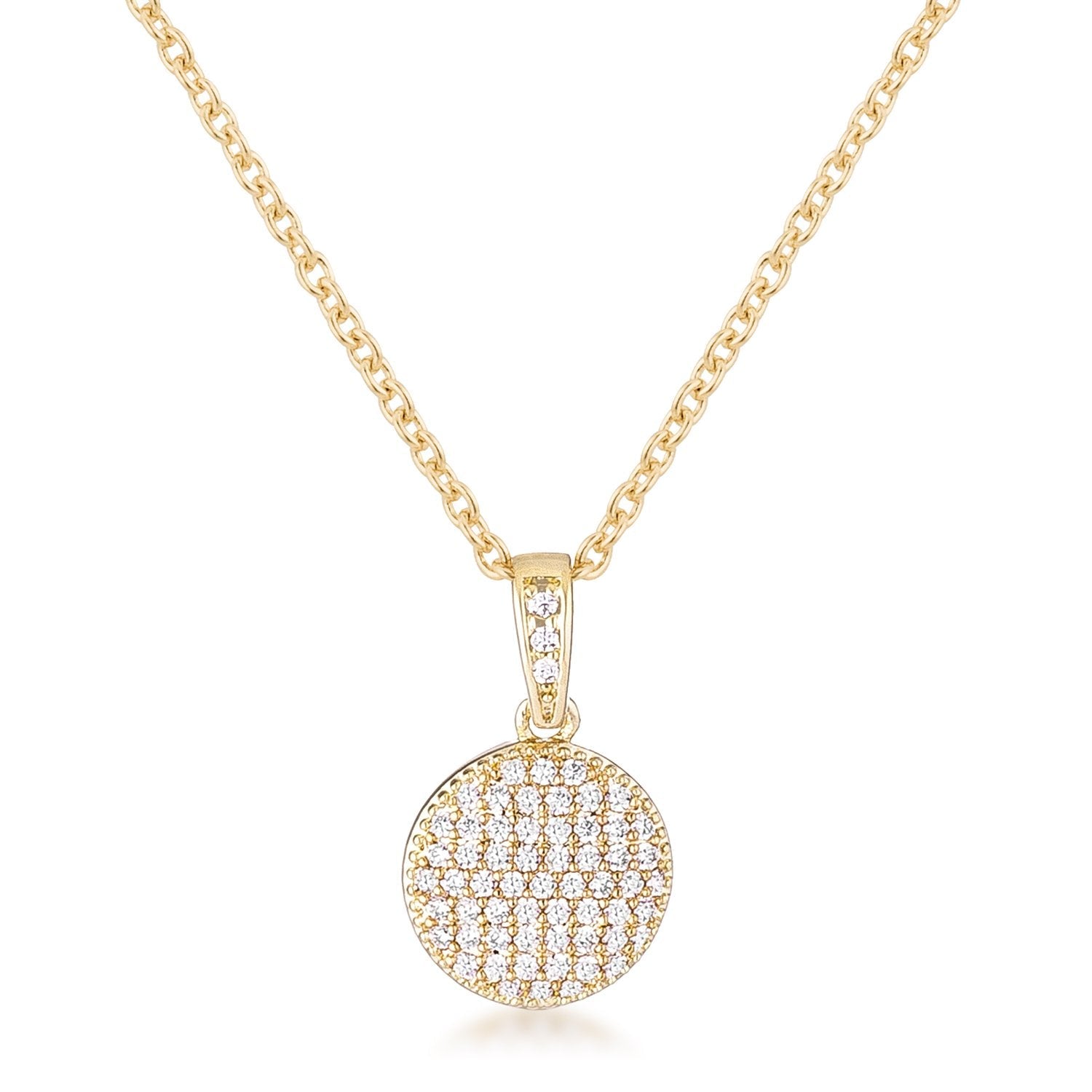 This necklace features a pave disc pendant that is beautifully set with dazzling clear cubic zirconia. The rest of the necklace is craftedin a brilliant gold finish.Classic and versatile this necklace will flatter any outfit with its subtle sparkle.