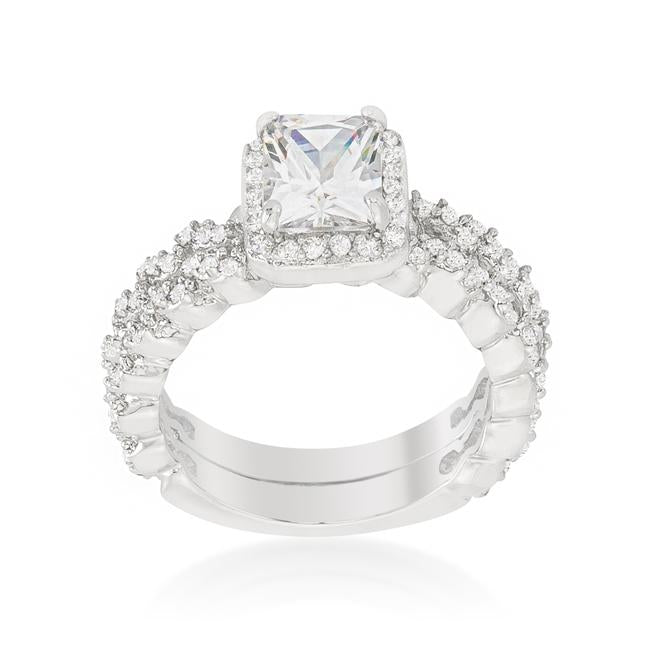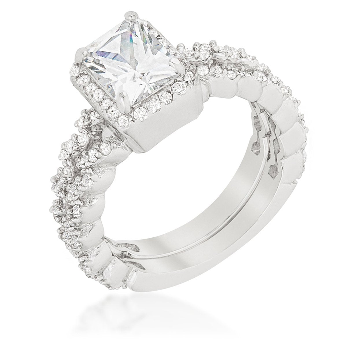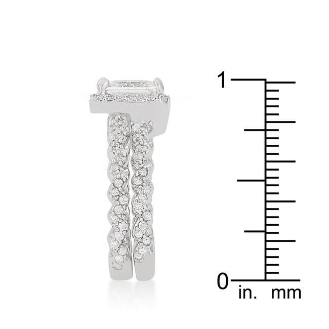 Elegant style is on display with this fabulous wedding set. Genuine Rhodium Plating is achieved using an electroplating process that coats the item with heavy layers of rhodium a close cousin to platinum which gives our jewelry a platinum luster.