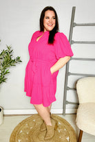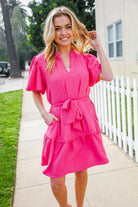 Star Struck Fuchsia Notched Neck Balloon Sleeve Sash Belt Mini Dress
