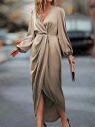 High-Low Surplice Balloon Sleeve Midi Dress