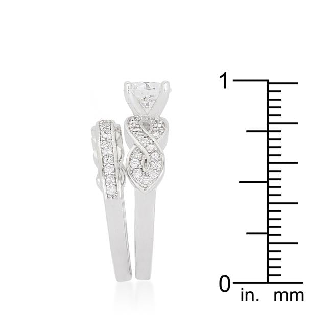 Beautiful and delicate this bridal set features an infinity twist engagement ring with side band in silver tone. Genuine Rhodium Plating is achieved using an electroplating process that coats the item with heavy layers of rhodium a close cousin to platinum which gives our jewelry a platinum luster.
