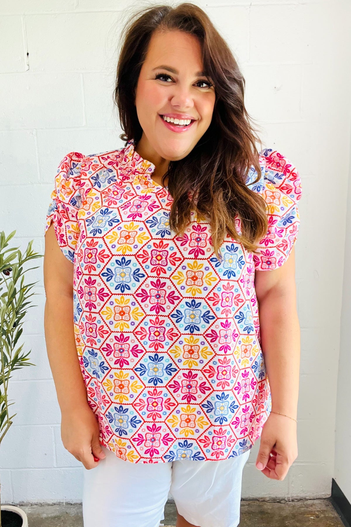 Brighten your casual closet while adding a touch of femininity with this floral lace print shirred puff sleeve top made with soft woven fabric. A stunning frill notch neck completes this versatile top.