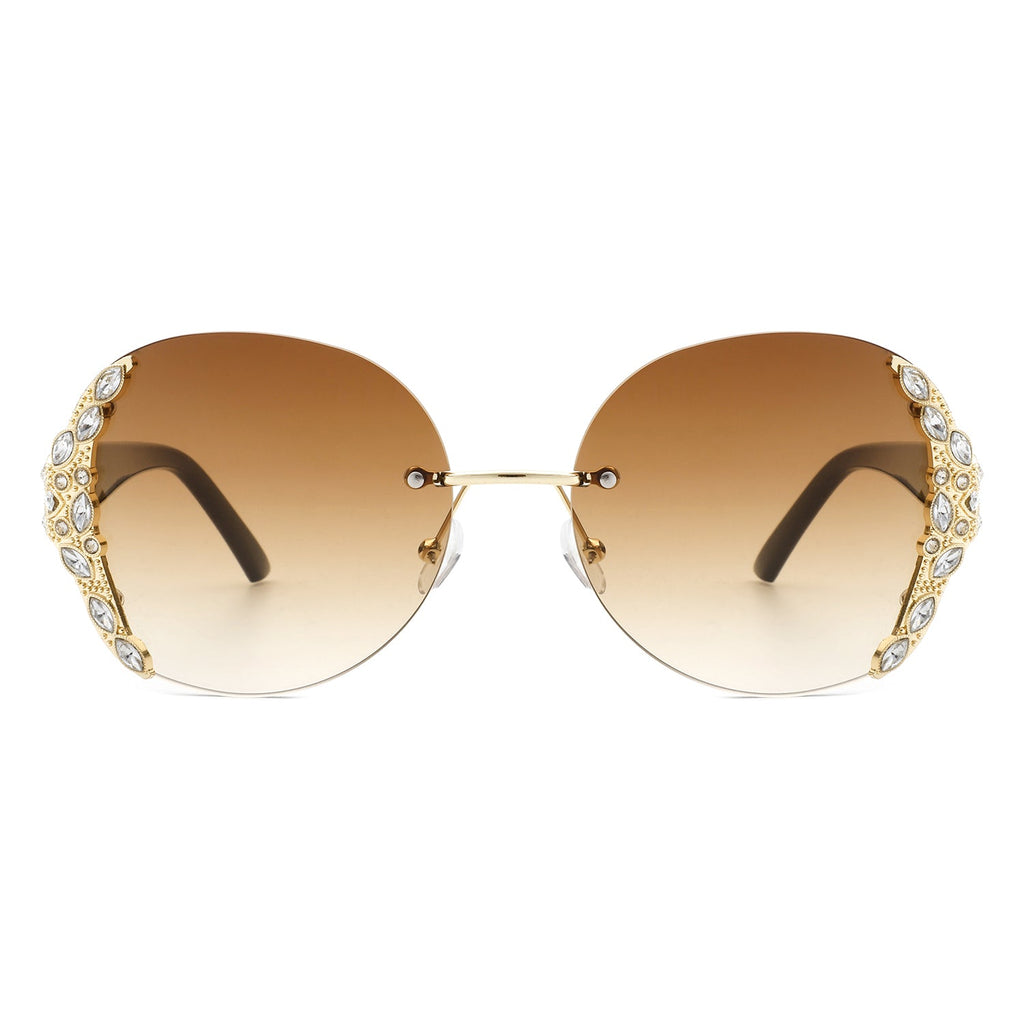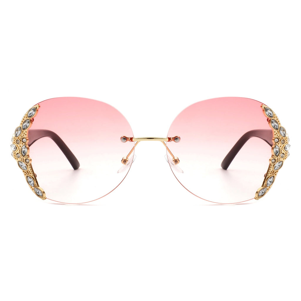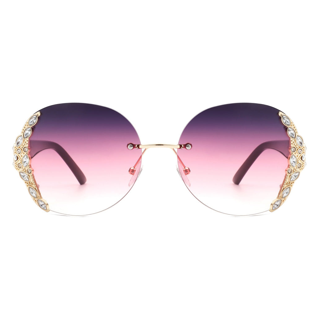 Jadeisle - Women Oval Rimless Rhinestone Design Round Oversize Sunglasses