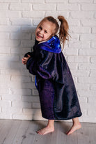 Introduce the little ones to the finer things in life with our Kids Oversized Hoodie Blanket! It's made from super soft poly velour with the coziest sherpa lining and has deep kangaroo pocket. Featuring a hooded neckline and balloon sleeves with banded, ribbed cuffs. Perfect for movie nights, errand runs, or just chilling around the house!