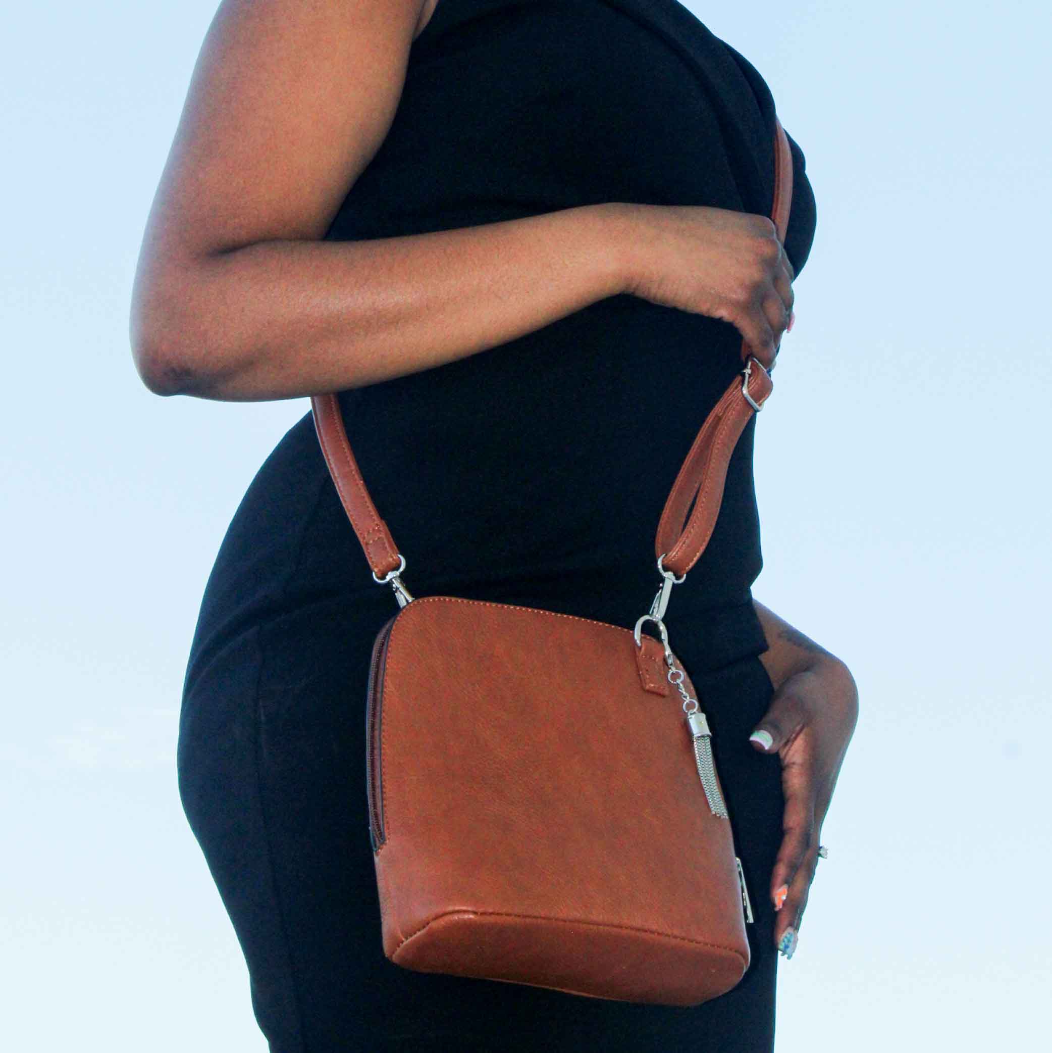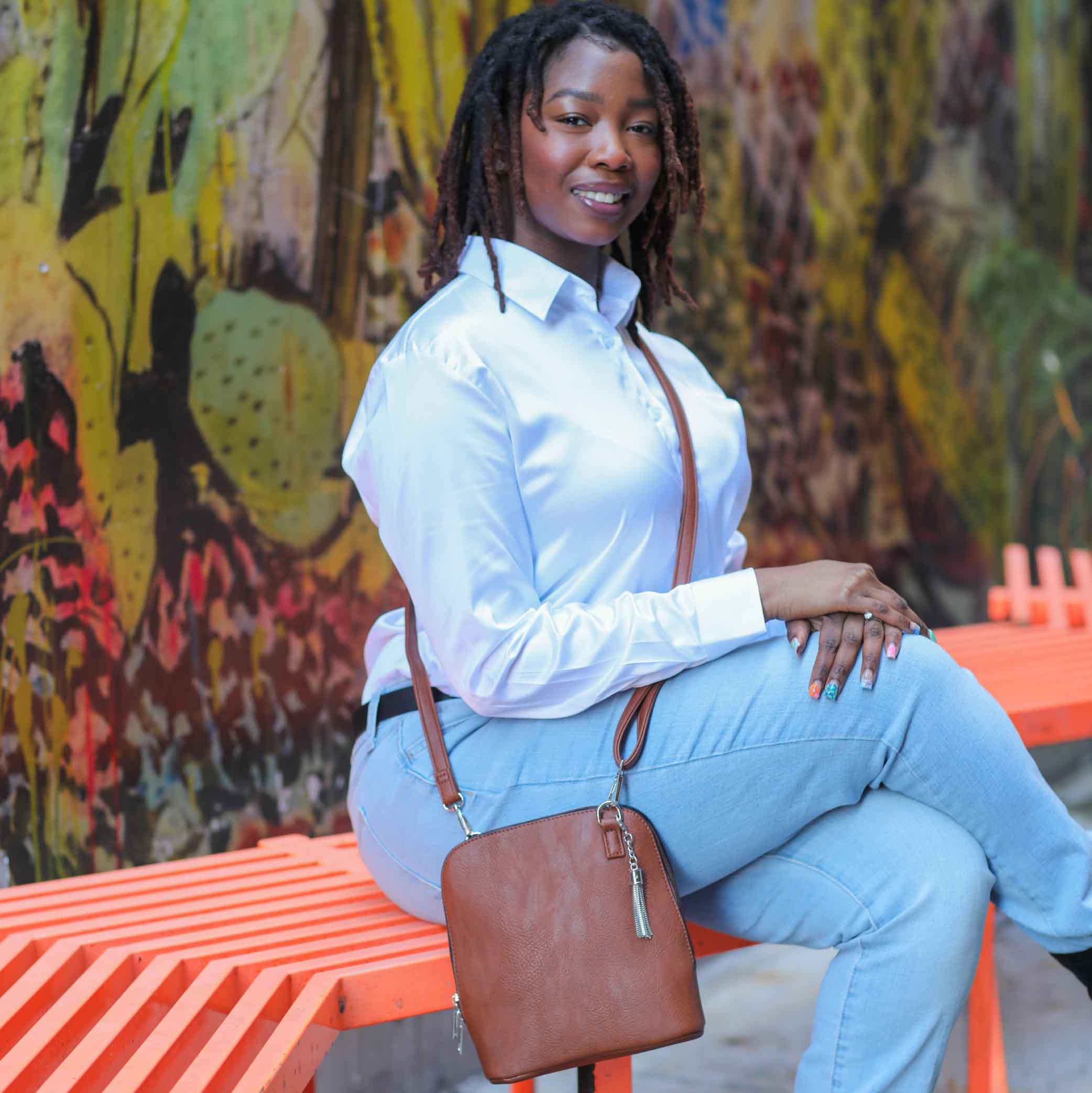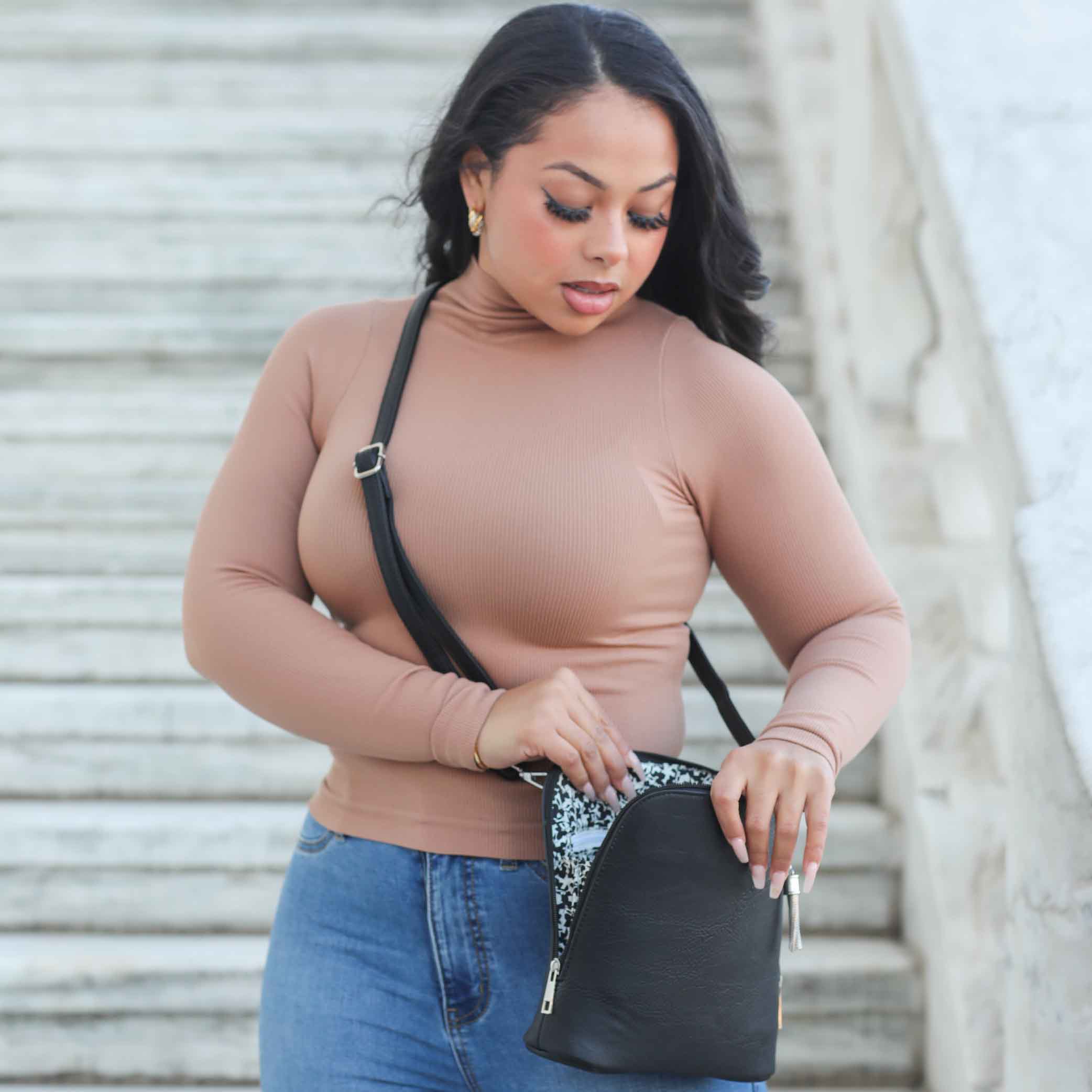 It may look small, but you will be pleasantly surprised to see how wide this bag opens. The zipper opens on all three sides giving this petite crossbody great accessibility and enough room to hold more than just the essentials! The metal tassel adds just the right finish!