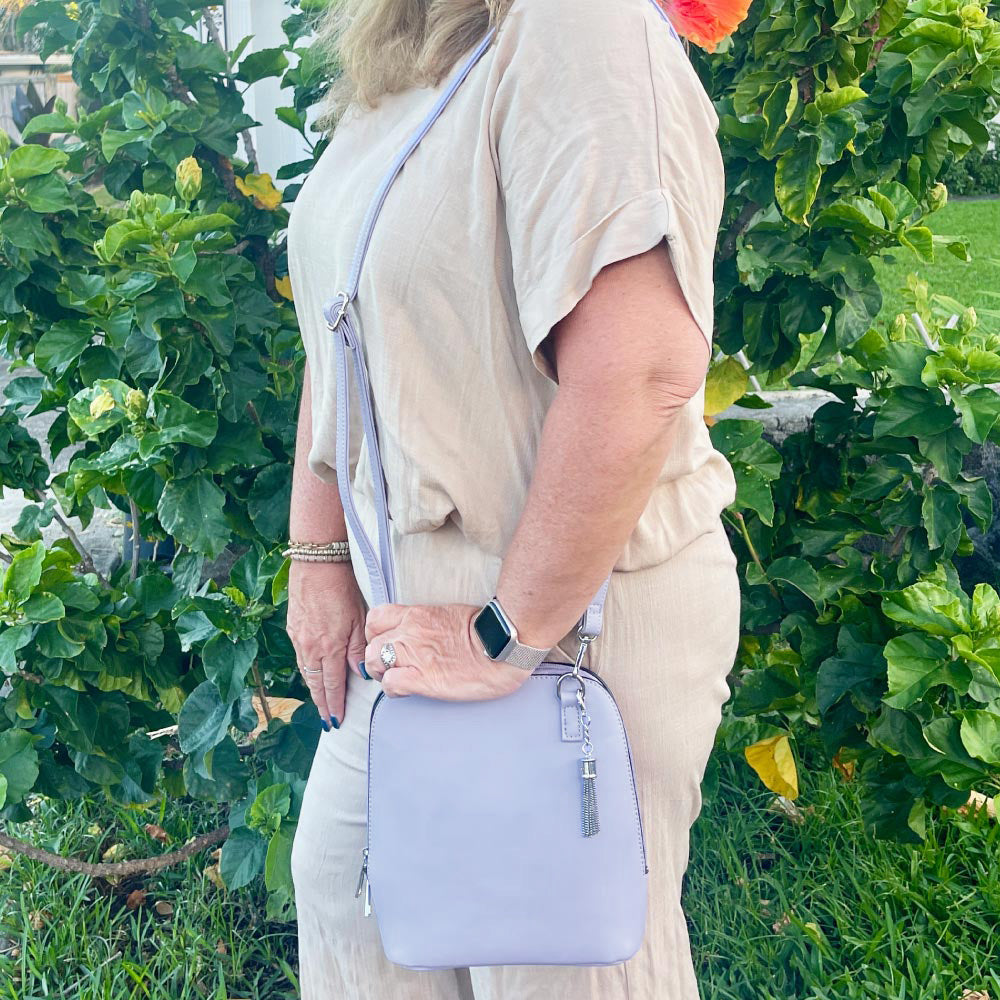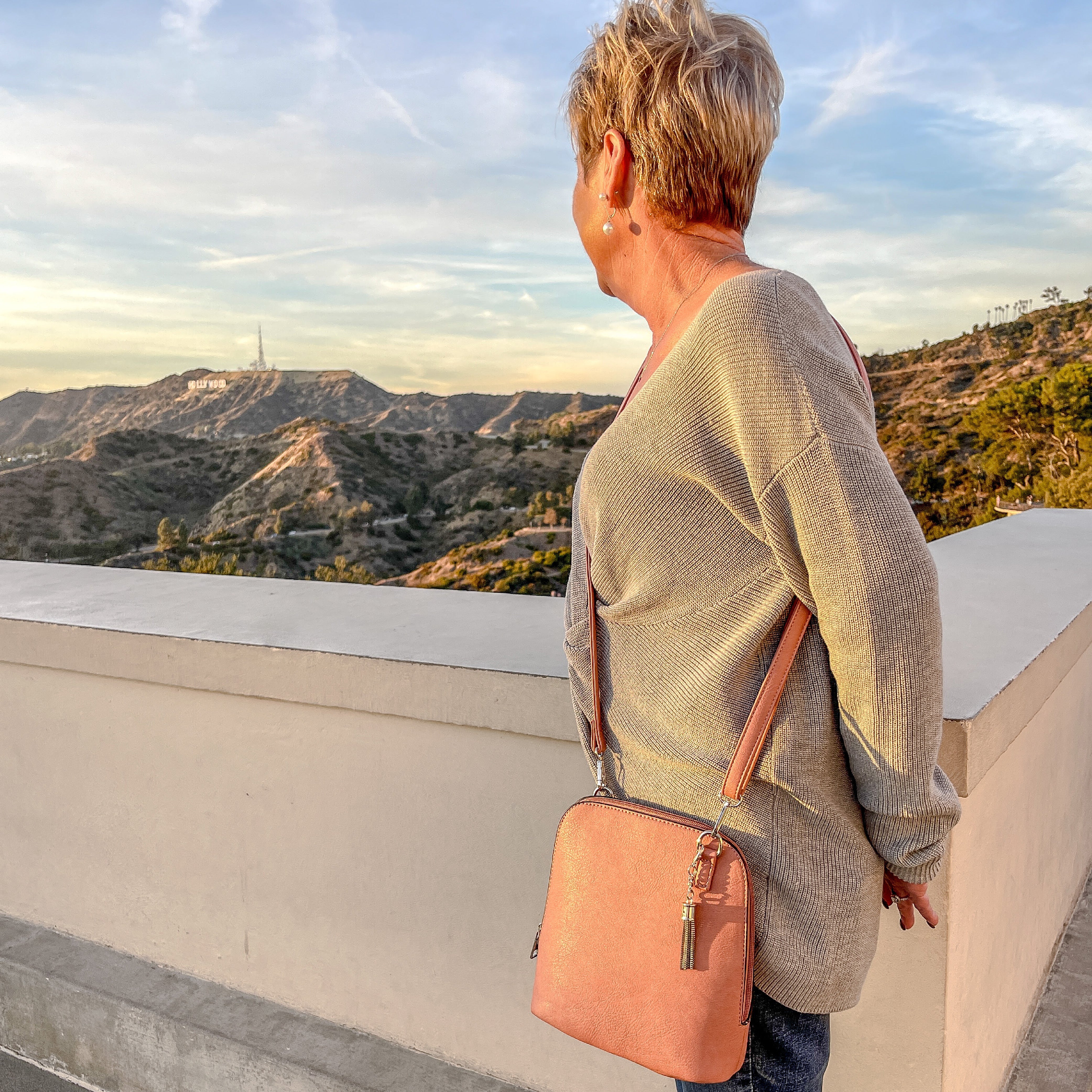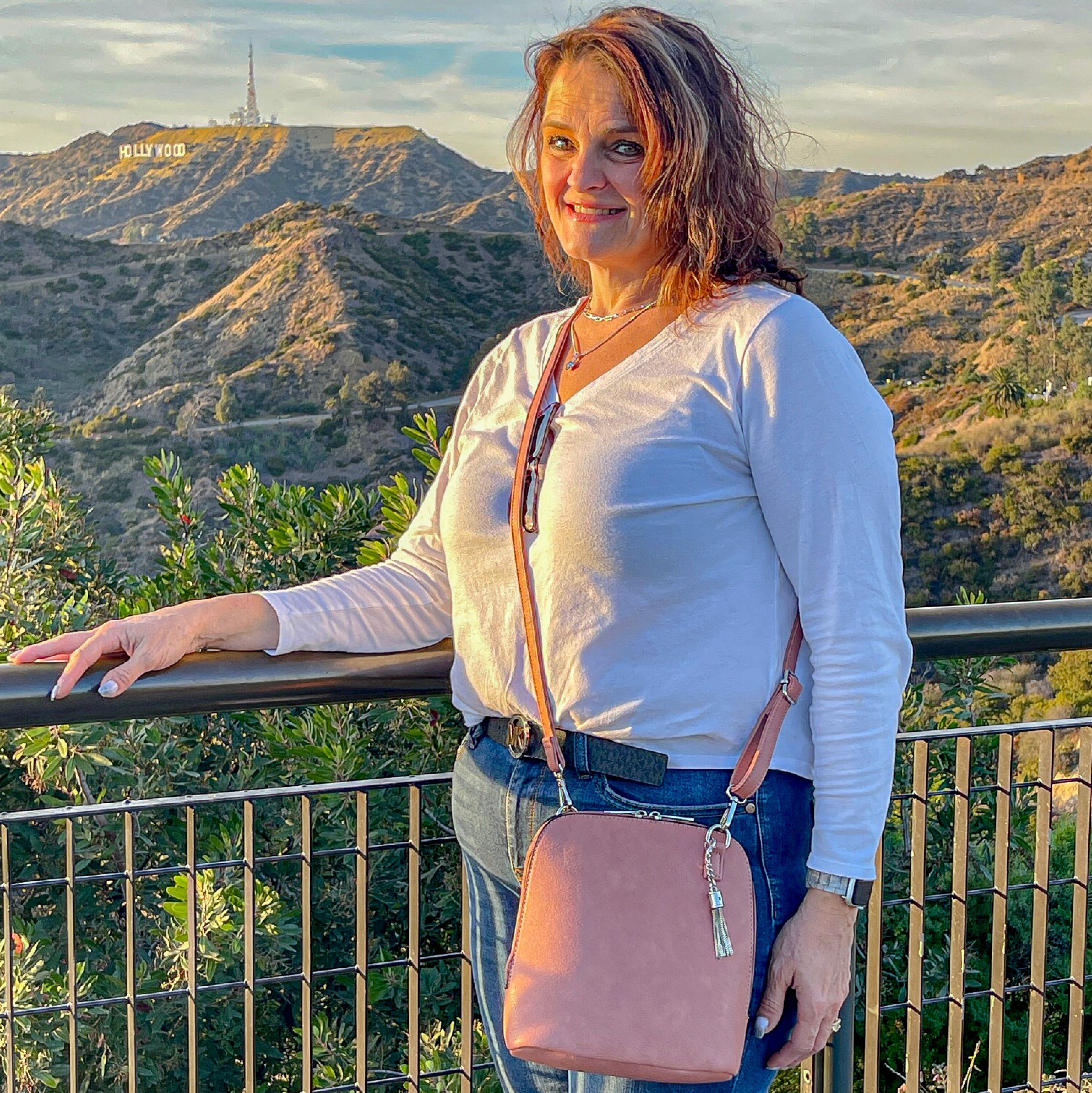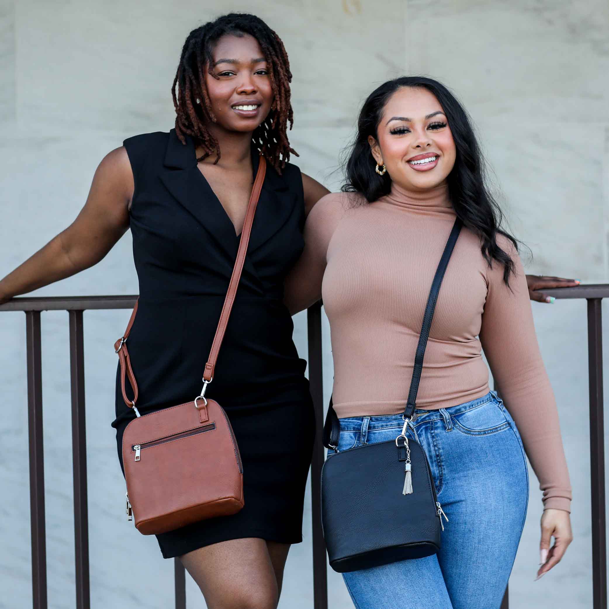 It may look small, but you will be pleasantly surprised to see how wide this bag opens. The zipper opens on all three sides giving this petite crossbody great accessibility and enough room to hold more than just the essentials! The metal tassel adds just the right finish!