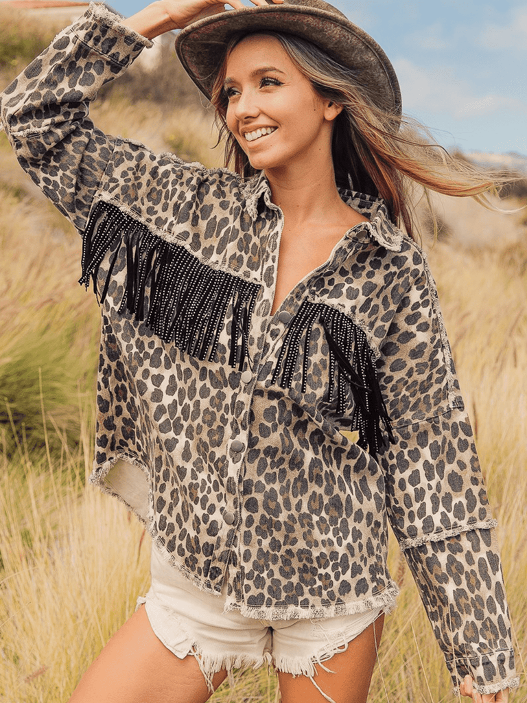 Leopard Fringe Detail Collared Neck Denim Jacket