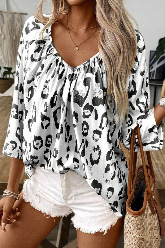 Leopard Print Ruched V Neck 3/4 Sleeve Blouse