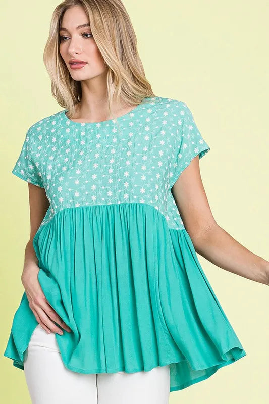 Add a touch of charm to your outfit with this embroidered short sleeve pleated babydoll top. The embroidered detailing offers a feminine and elegant touch. The pleated design adds texture and dimension to the top. Perfect for a casual yet stylish look that can easily transition from day to night. Pair with jeans or shorts for a cute and chic ensemble. Embrace a trendy and versatile style with this adorable top.