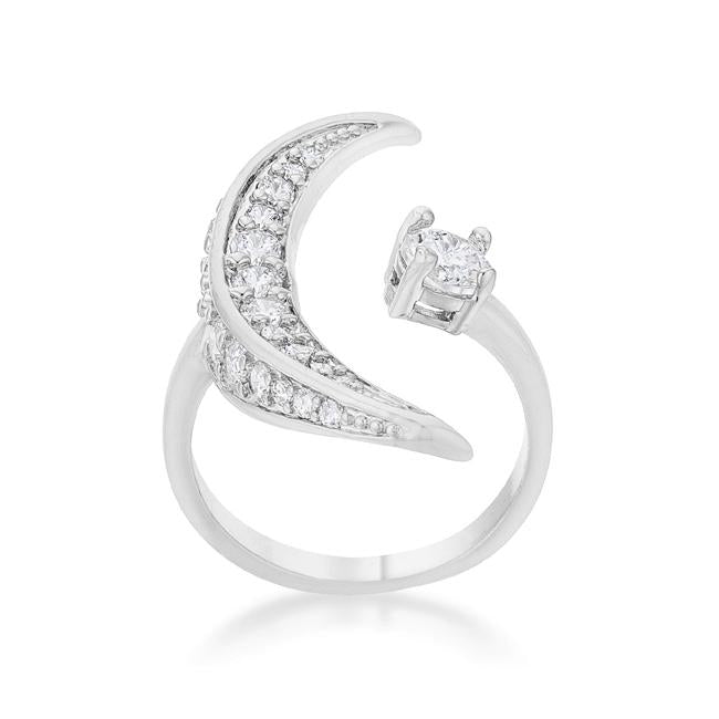 Clear stones accent a moon design in this delicate wrap ring. Delicate and subtle yet makes a trendy statement. Our genuine rhodium finish is achieved using an electroplating process that coats the item with heavy layers of rhodium a close cousin to platinum. This gives our jewelry a platinum luster.