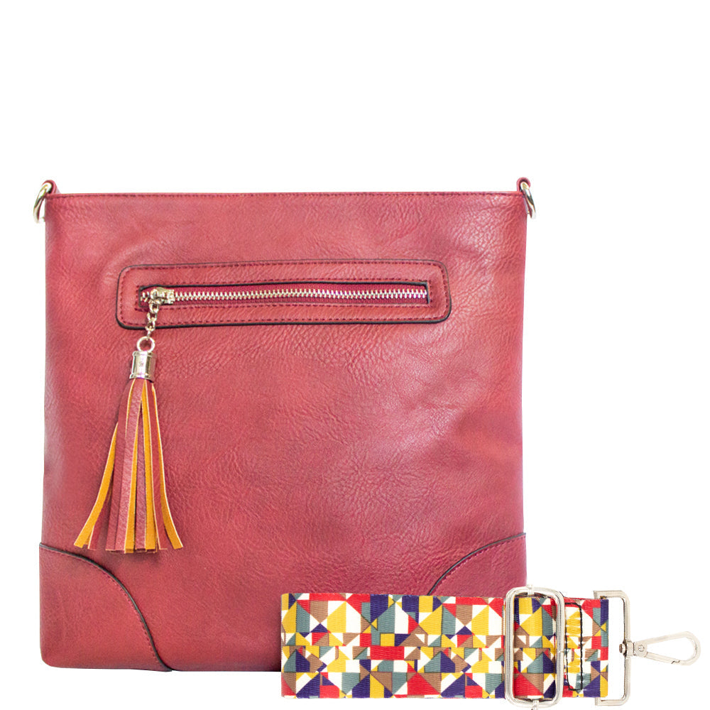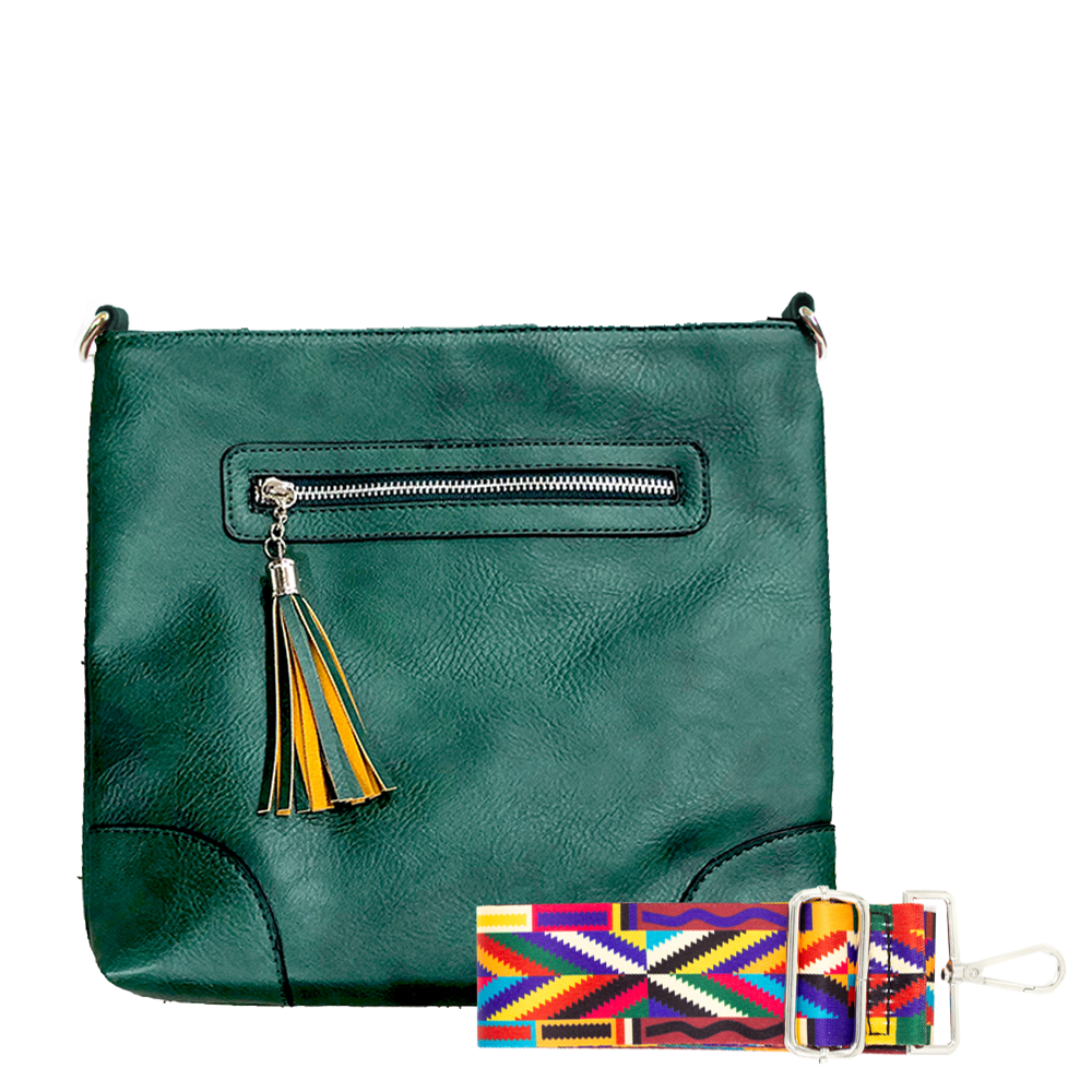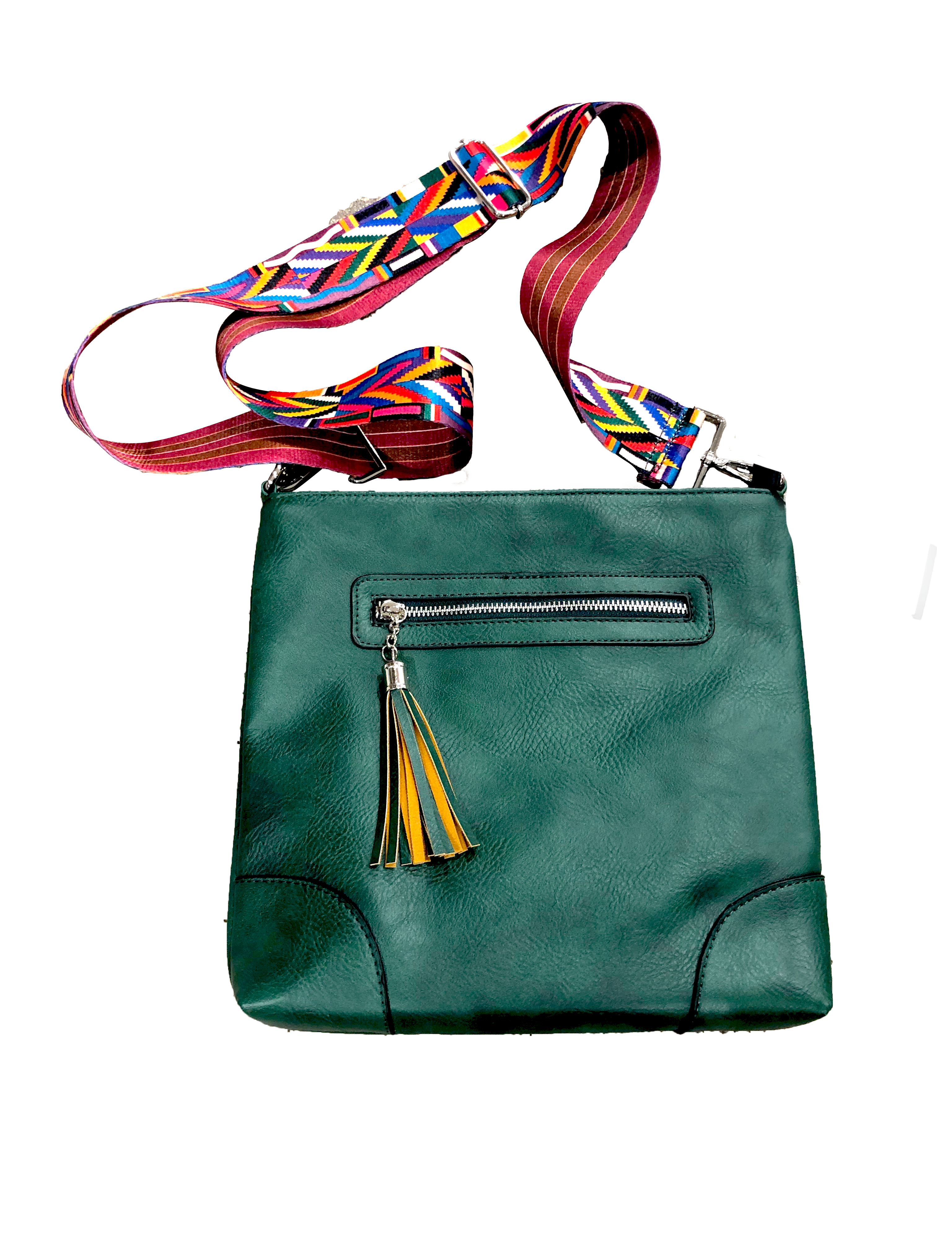 Great flat shape sits comfortably on your hip. Front zipper pocket for easy in and out. Comes with 2 strap options – a colorful guitar strap to add flare to every outfit and a solid vegan leather strap to match the handbag.