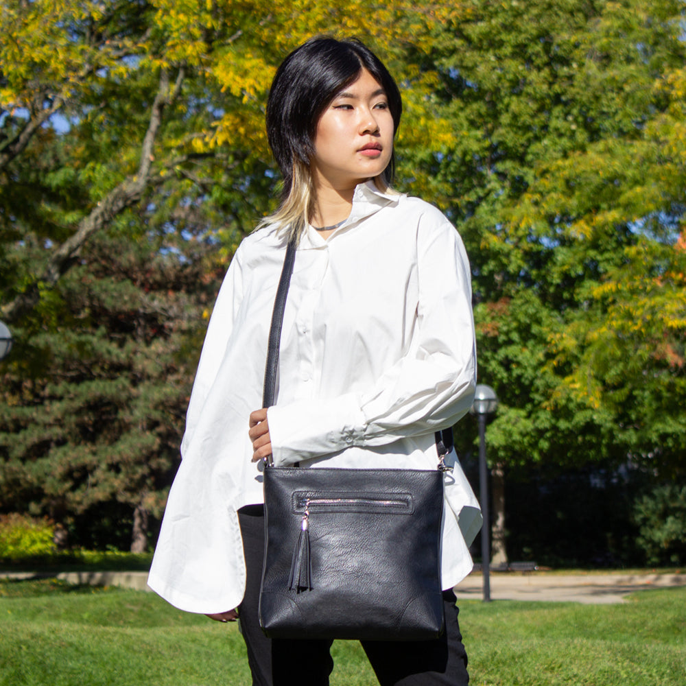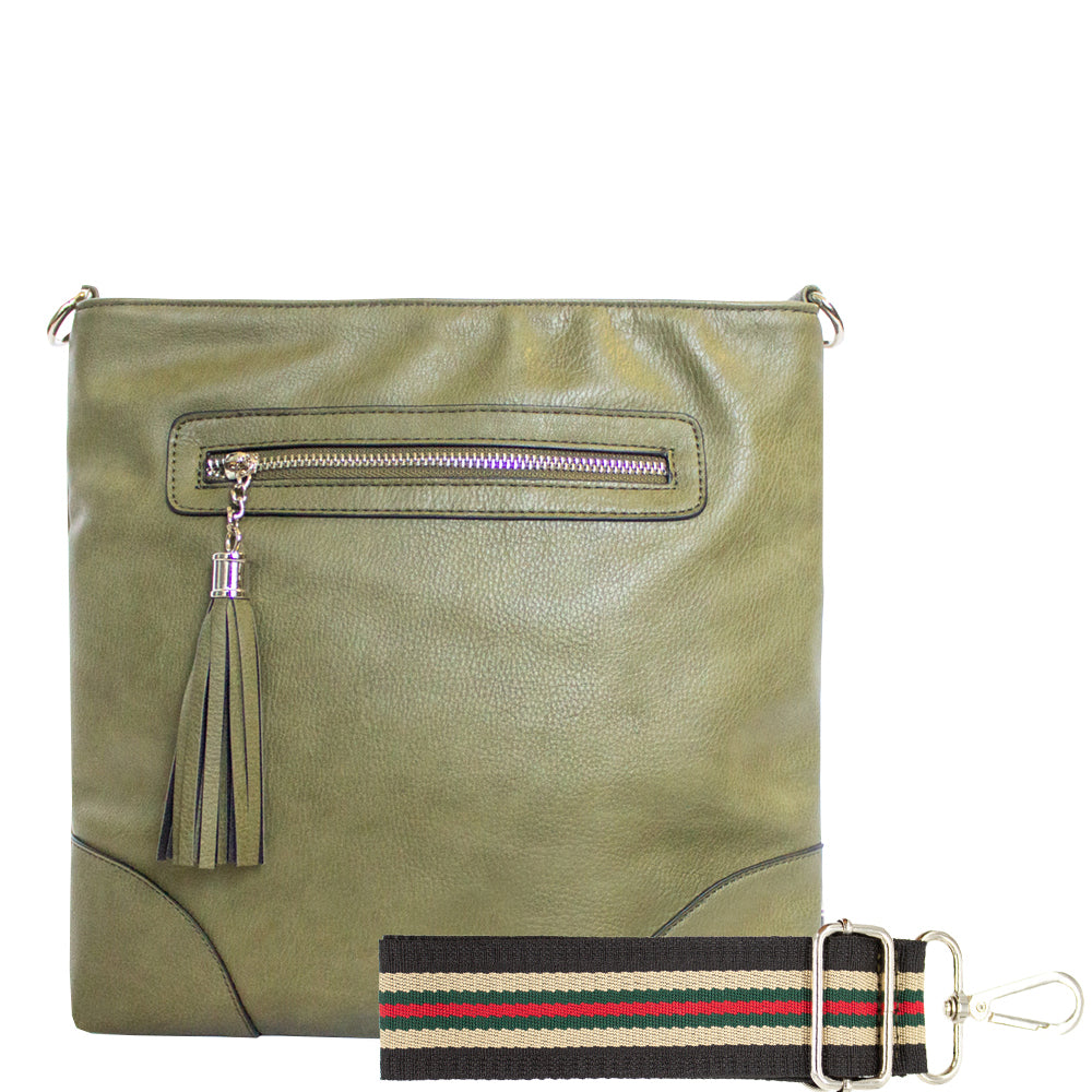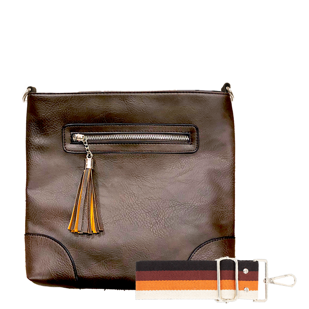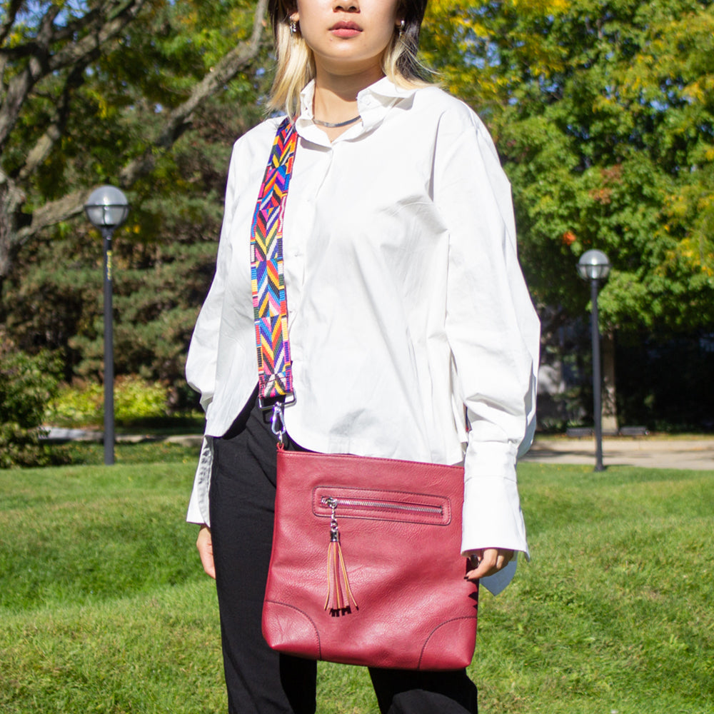 Great flat shape sits comfortably on your hip. Front zipper pocket for easy in and out. Comes with 2 strap options – a colorful guitar strap to add flare to every outfit and a solid vegan leather strap to match the handbag.