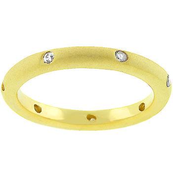 Feminine and subtle this eternity wedding band is a pleasuring mix of matte gold bonded and handset cubic zirconia. Fit for a woman. 18k plated gold is achieved using an electroplating process that coats the item with heavy layers of 18k Yellow Gold and color-treated to display a perfect 14k Hamilton gold color.