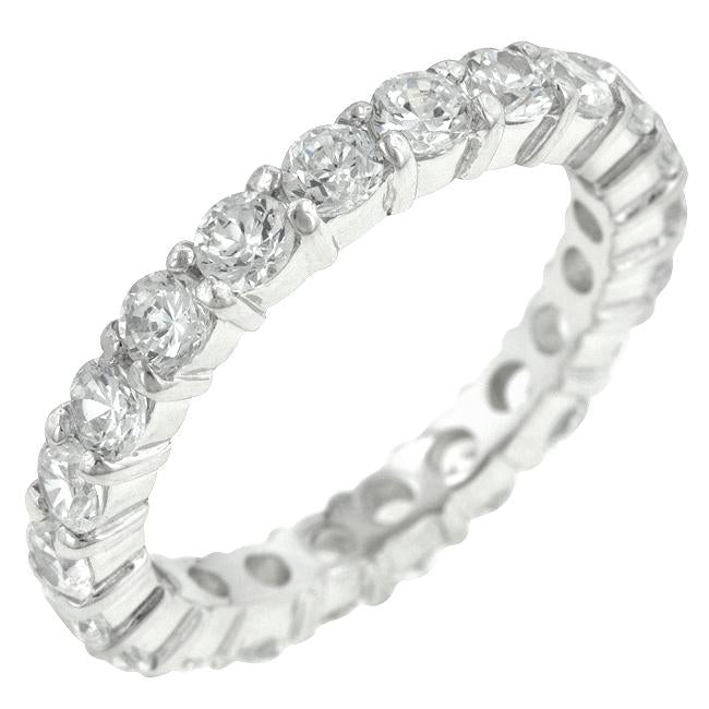 Mini Elizabeth Eternity Band features genuine rhodium plating to .925 sterling silver base metal. Twenty-one stones embellish this wonderful ring. Our genuine rhodium finish is achieved using an electroplating process that coats the item with heavy layers of rhodium a close cousin to platinum which gives our jewelry a platinum luster.