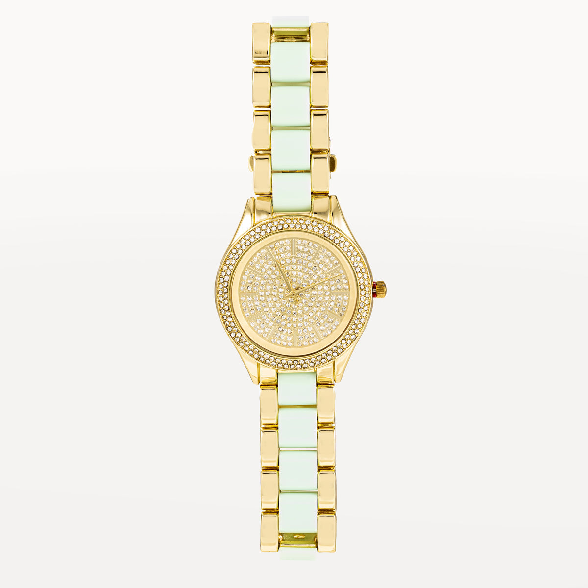 Indulge in luxury with this gold overlay watch, featuring mint links and a touch of bling. The perfect accessory to add some glamour to your outfit.