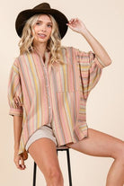 This button-down shirt features chic stripes and trendy bubble sleeves for a modern and stylish look. The striped pattern adds a classic touch, while the bubble sleeves add a fun and unique twist to the design. Perfect for both work and casual outings, this shirt can be dressed up or down with ease. The button-down front allows for versatile styling options, whether tucked in or worn loose. Elevate your wardrobe with this fashion-forward piece that combines sophistication with a touch of whimsy. Stay on-trend with this striped bubble sleeve button-down shirt!