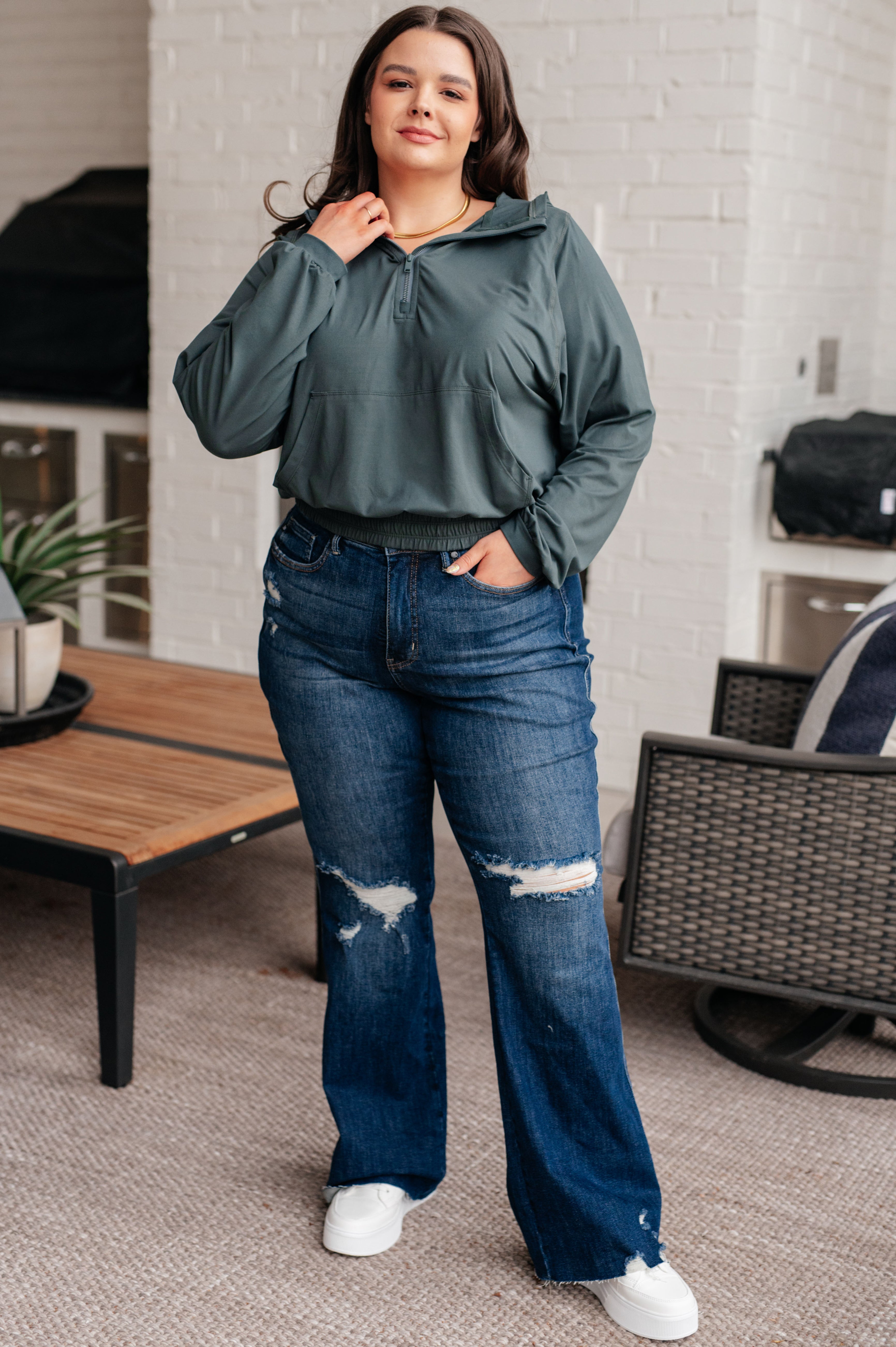 Invest in the perfect "running buddy" with our Morning Run Half Zip Hoodie in Smoked Spruce. Made with brushed microfiber for a soft touch, this hoodie also features a half zip for ventilation and a smocked elastic waistline for a flattering fit. Complete with a hood and kangaroo pocket for added convenience, this hoodie is the perfect addition to your closet!