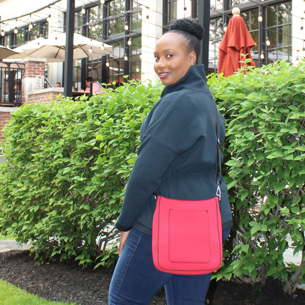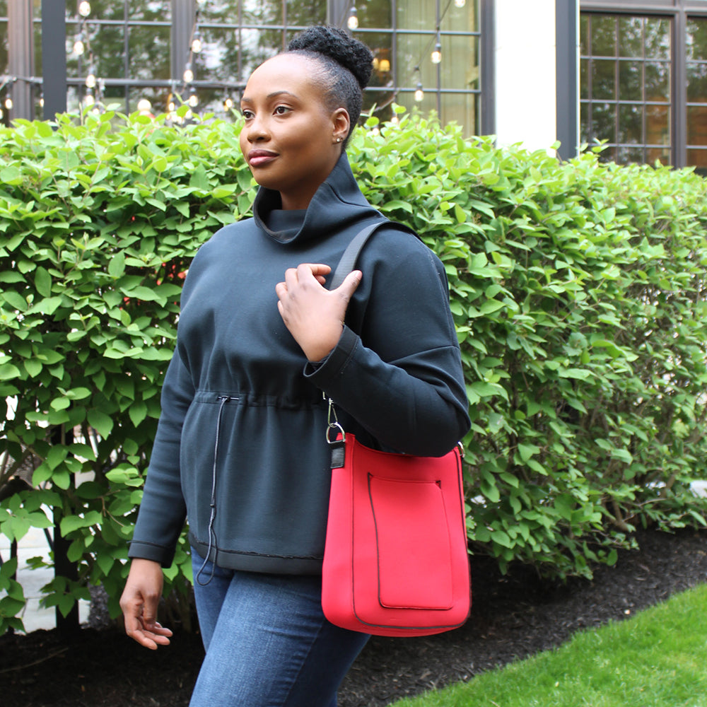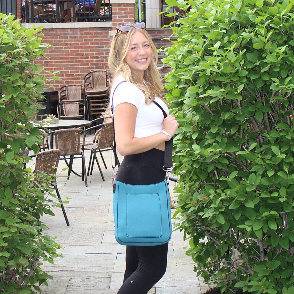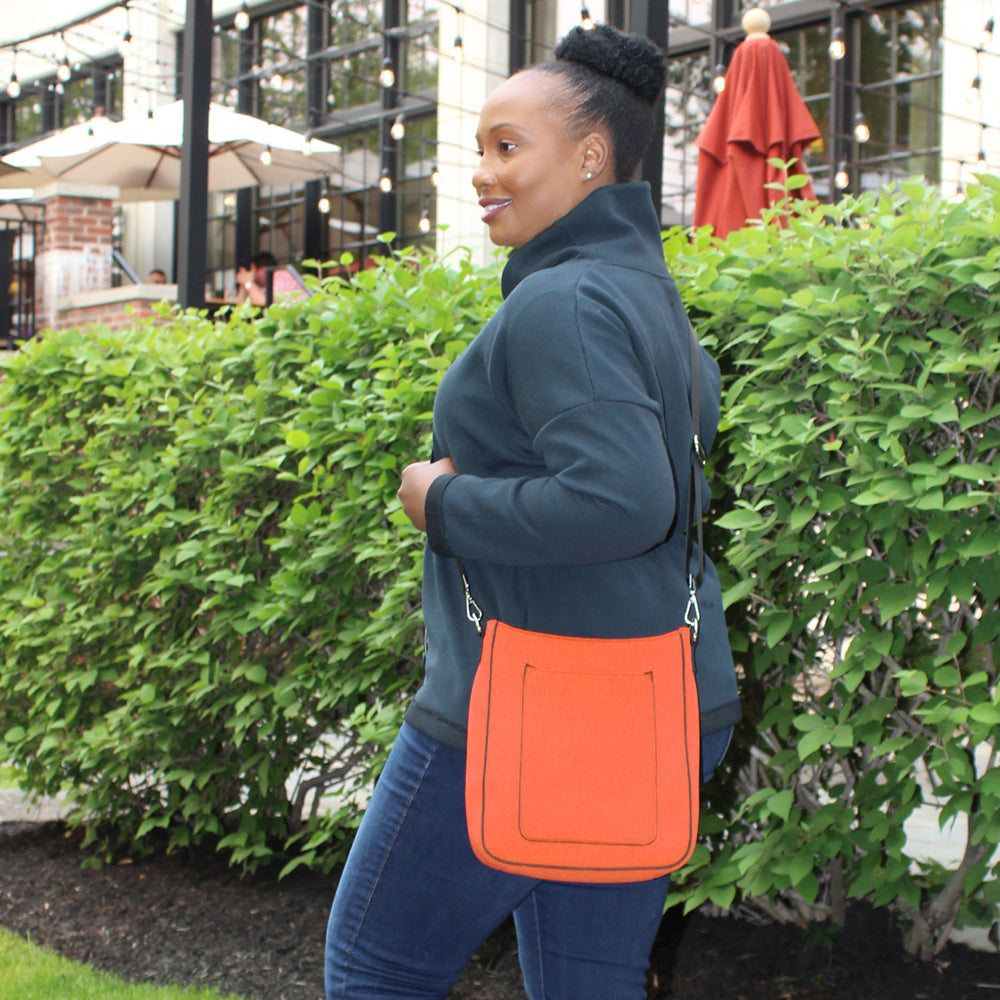 The best size bag we offer! It lays flat on your hip, with an adjustable nylon strap to wear as shoulder bag or crossbody. Inside, you’ll find 2 open pockets for your phone and organization. It has a capacity to hold a small laptop, water bottles and so much more. Made of neoprene, the bag is a fun sporty additional to your dressier handbags. It is lightweight, elastic and flexible, resistant to scratches, heat, oil, water, making it easy to clean. Named after Mia Hamm for her Olympic success, her being the best female soccer player in history.