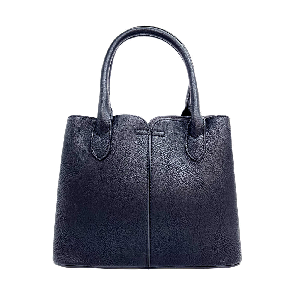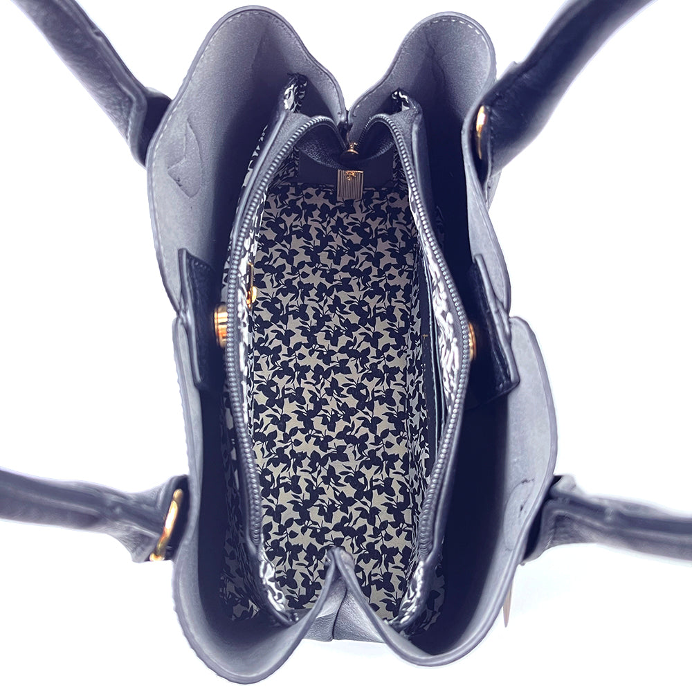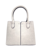 Vegan leather satchel. Detachable crossbody strap, 3 compartments. Center zipper close, two side compartments, snap closure. Includes 2 built-in RFID-protected card