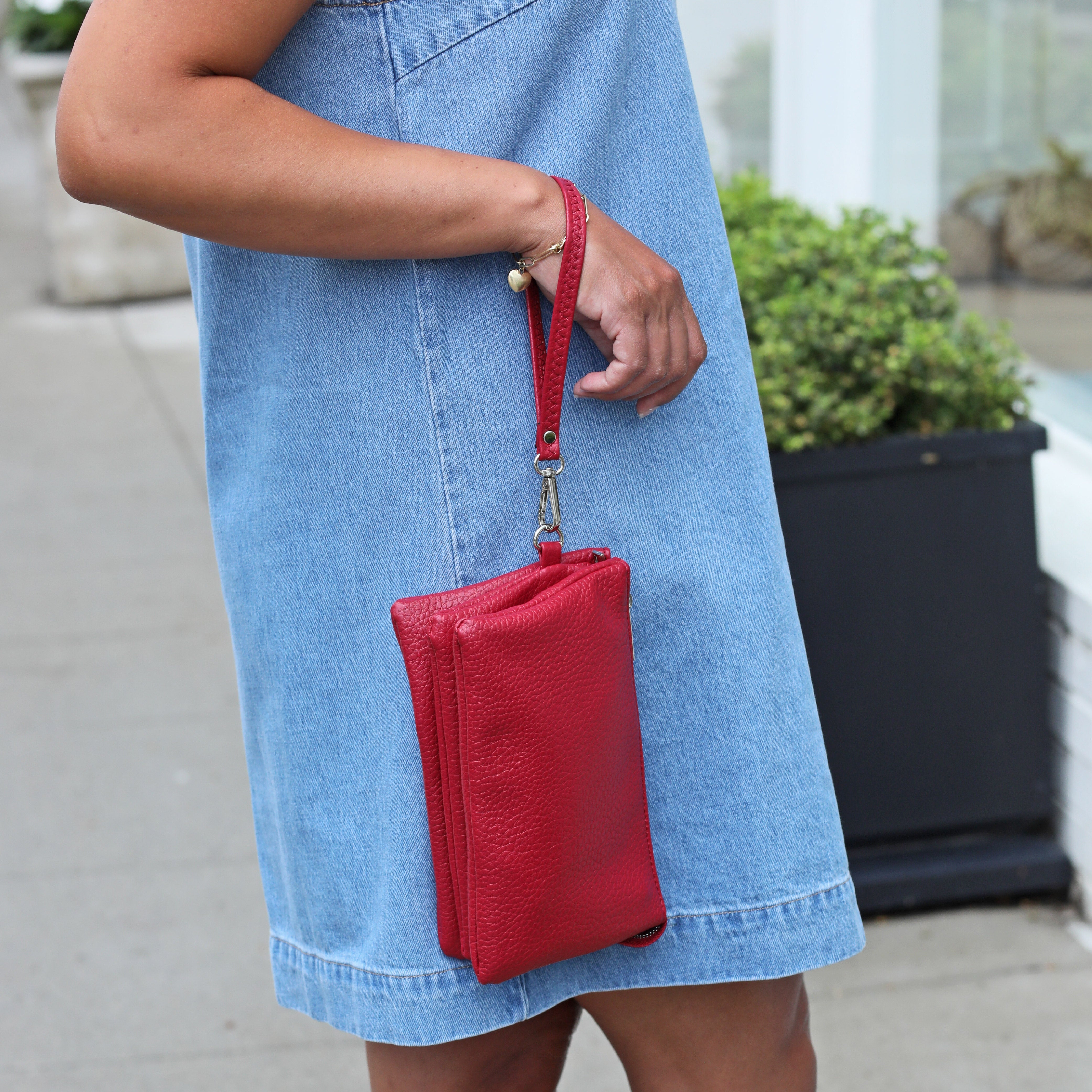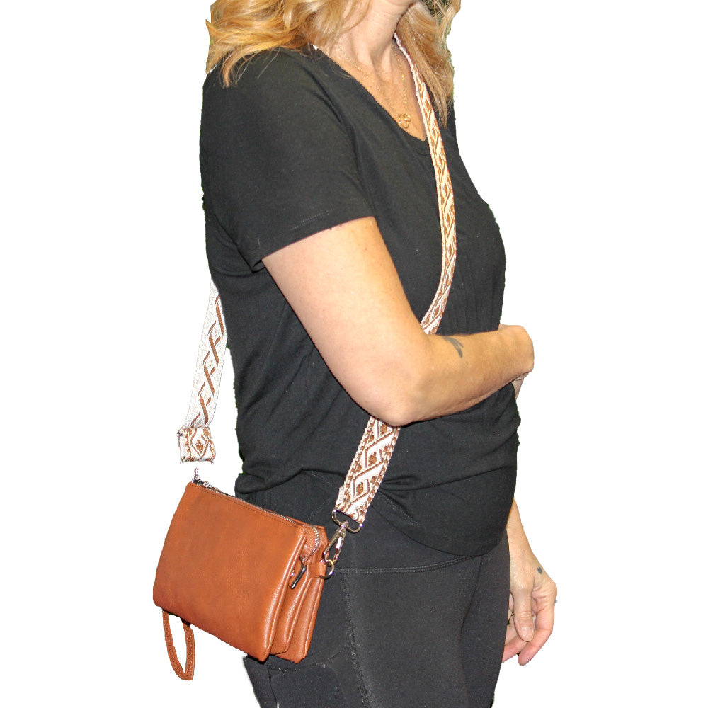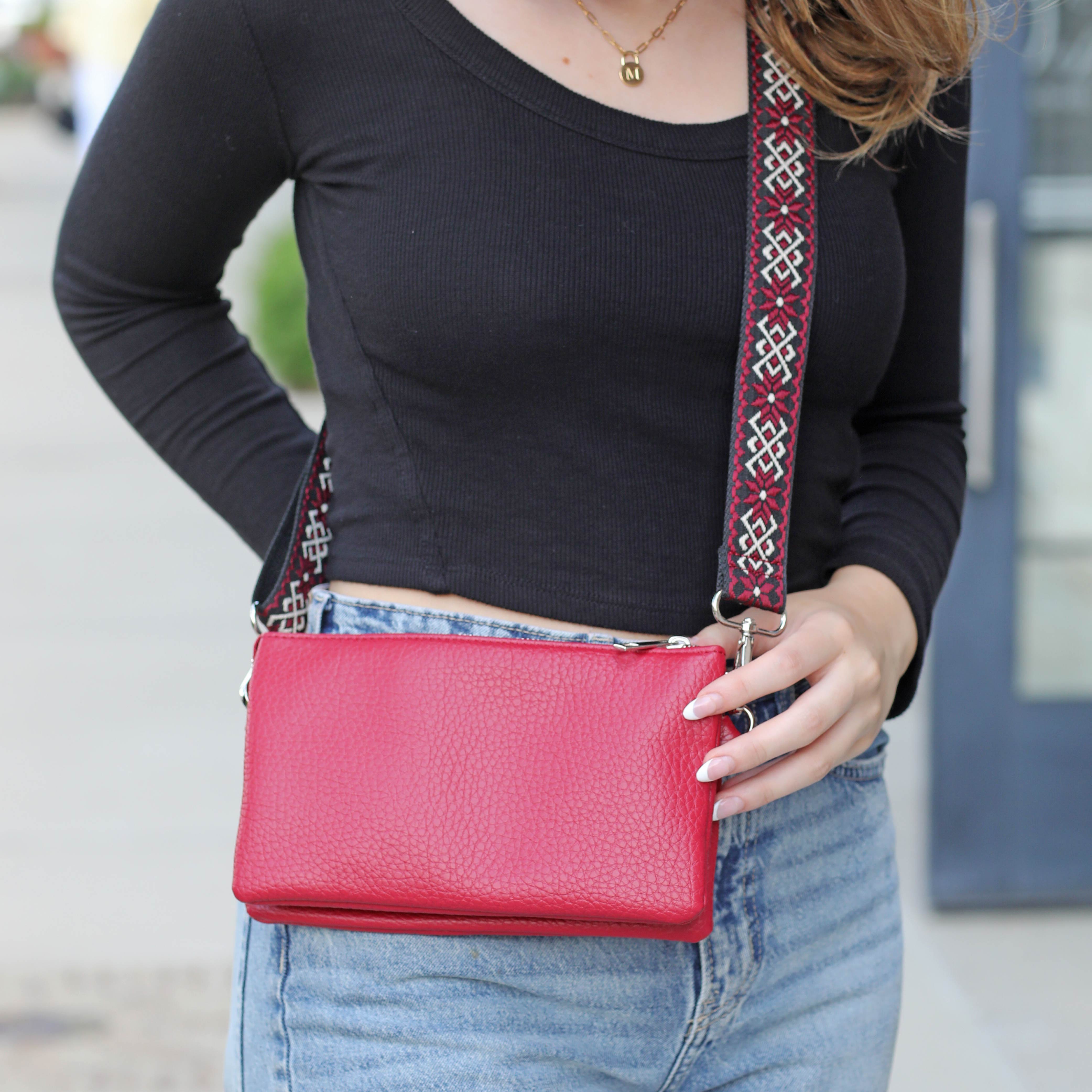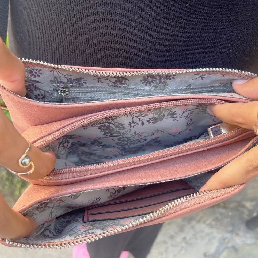 If you like organization, this bag is for you! Three separate compartments, including a center zippered area. Carry your phone, sunglasses, lipstick and more! You can even fit a small wallet, but with the 3 built-in card sleeves, you won’t need it!