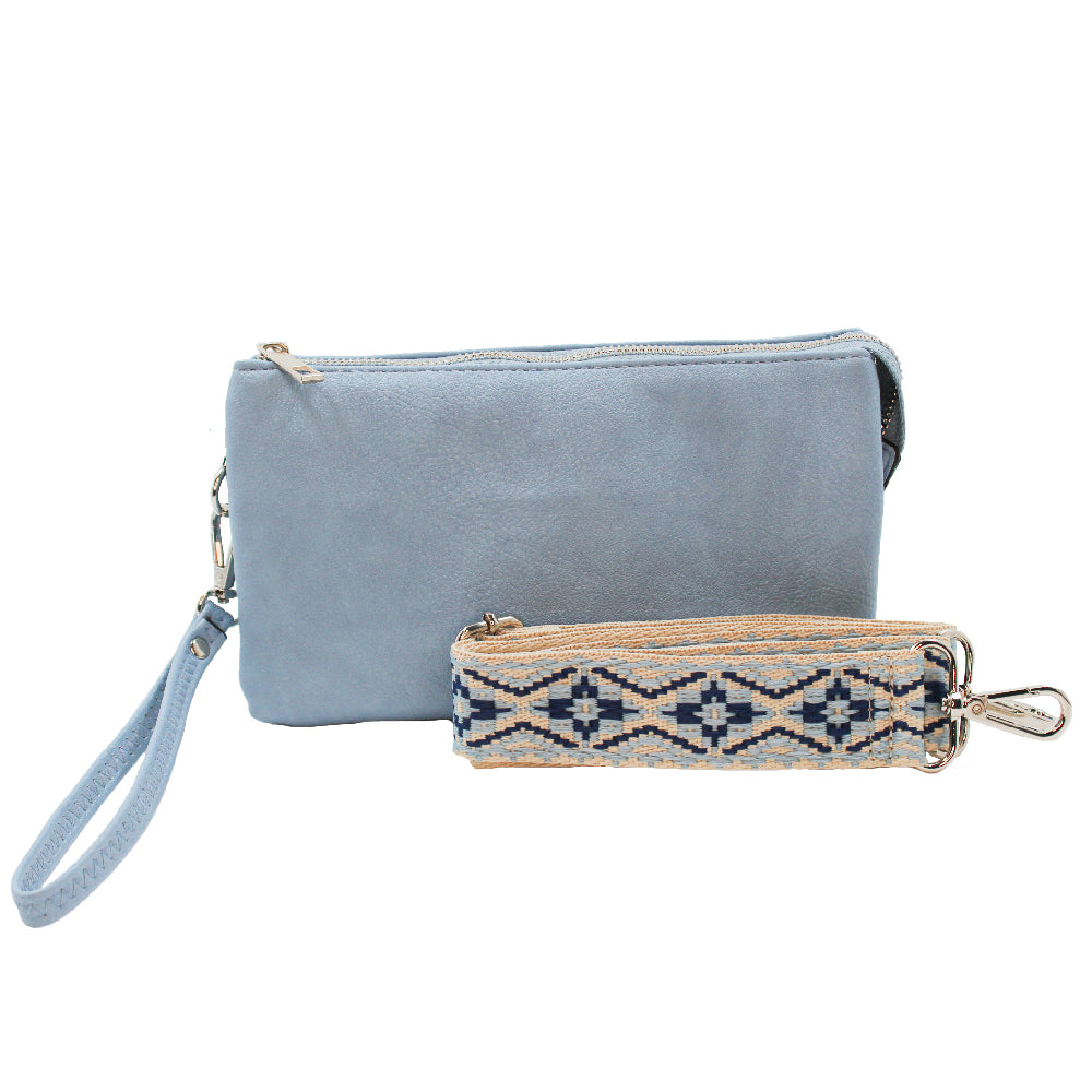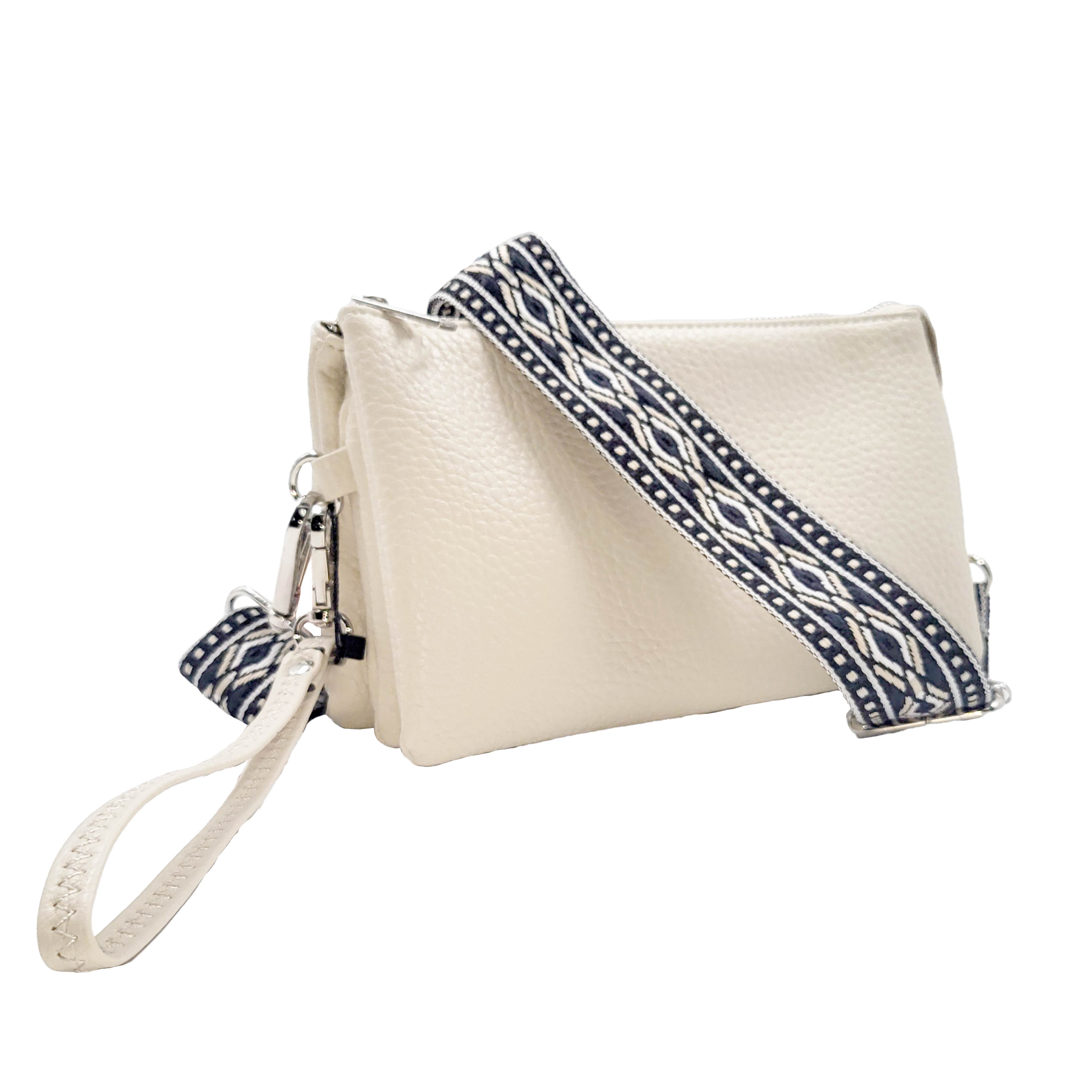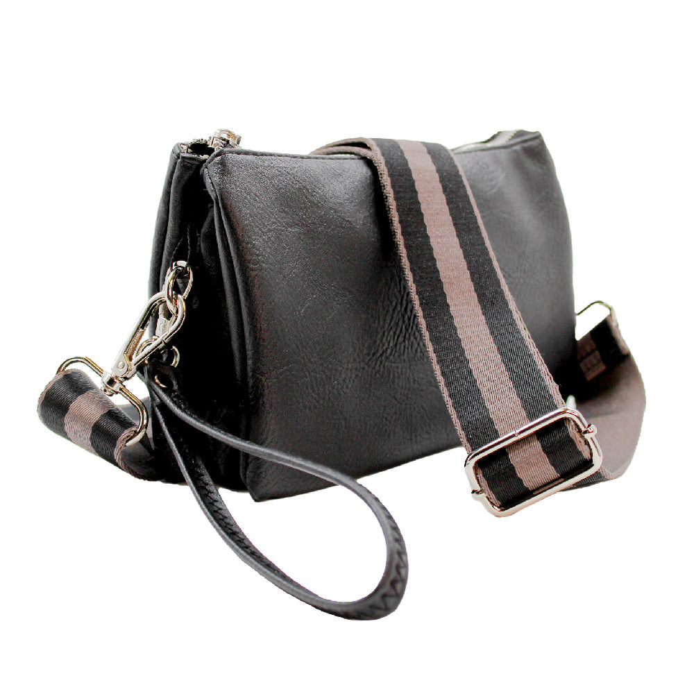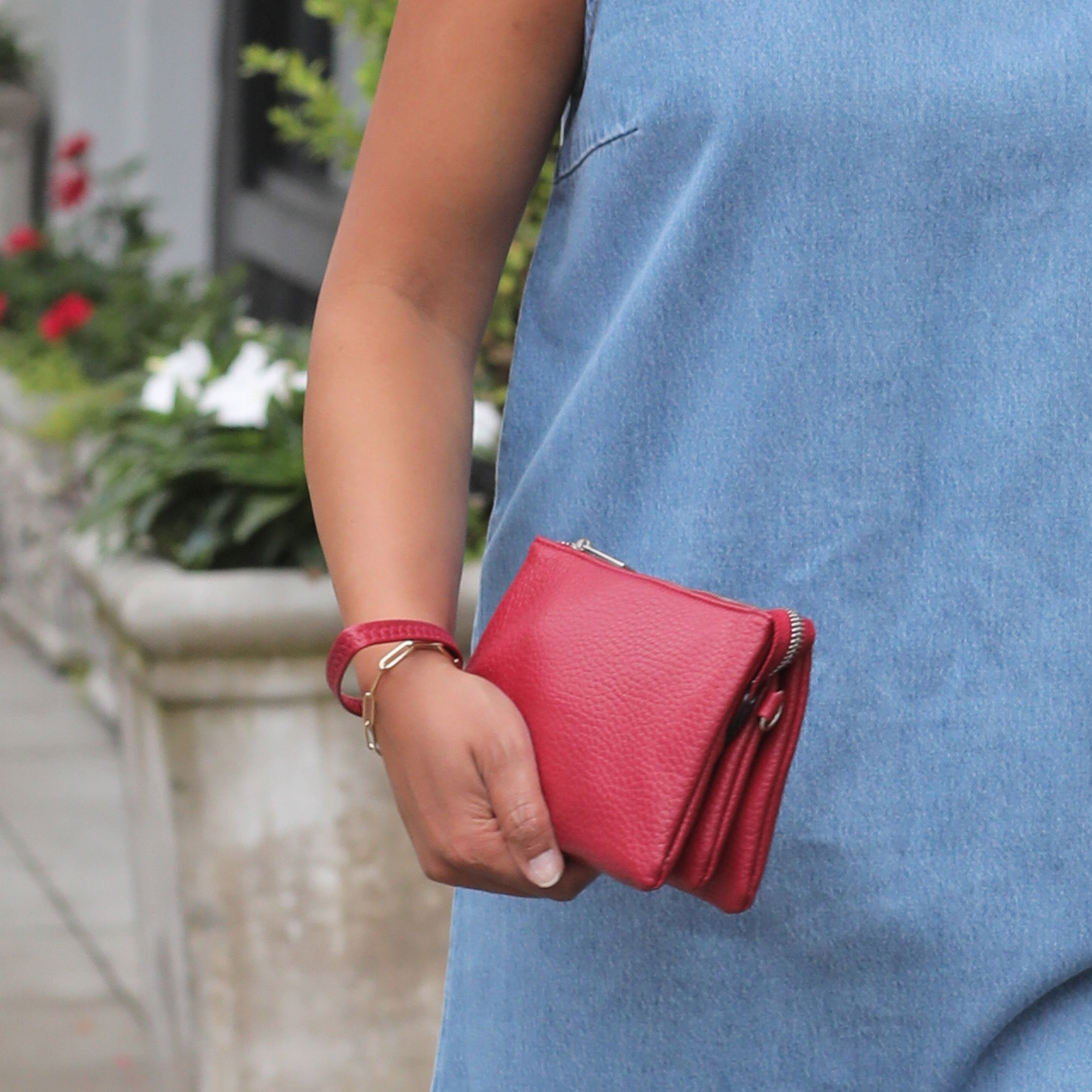 If you like organization, this bag is for you! Three separate compartments, including a center zippered area. Carry your phone, sunglasses, lipstick and more! You can even fit a small wallet, but with the 3 built-in card sleeves, you won’t need it!