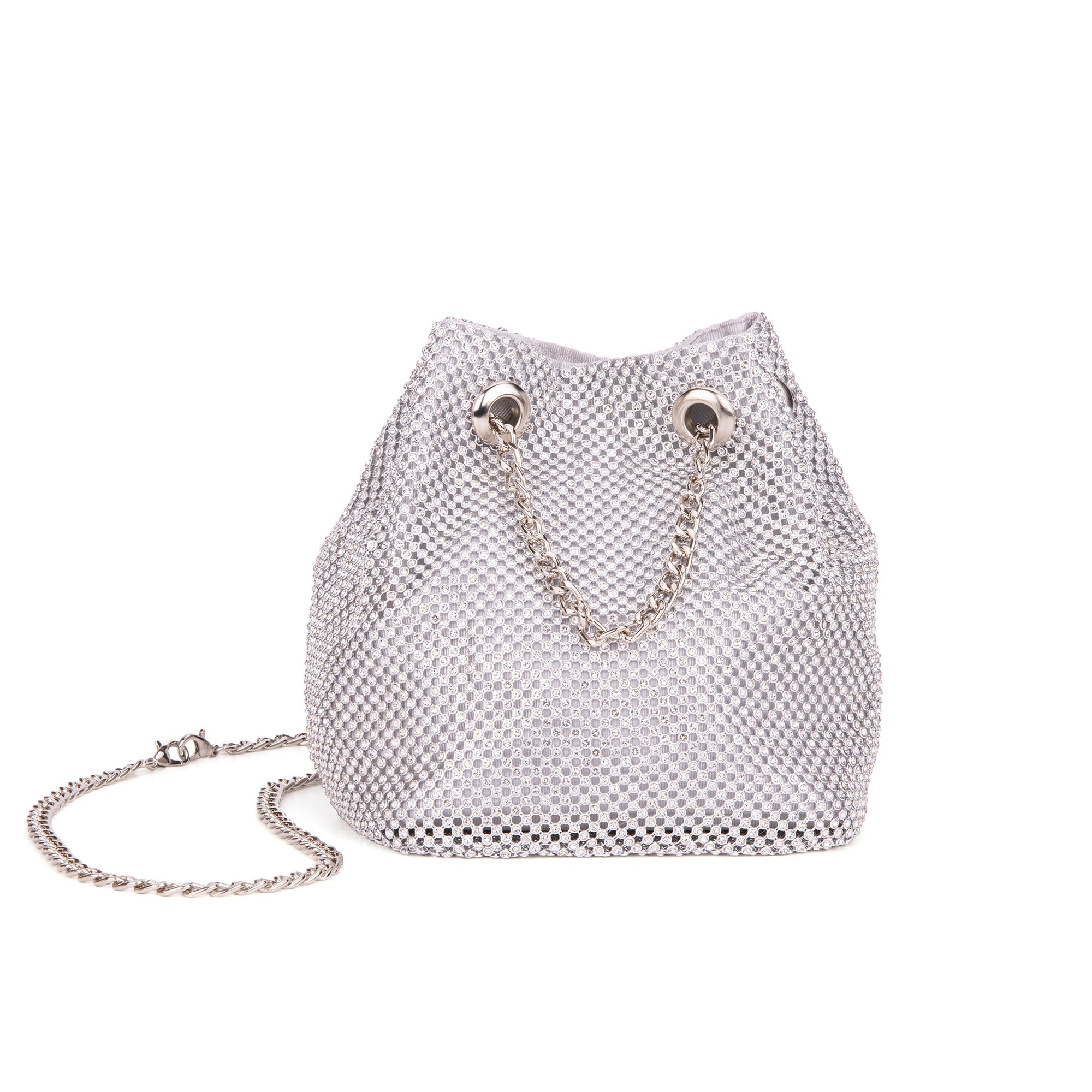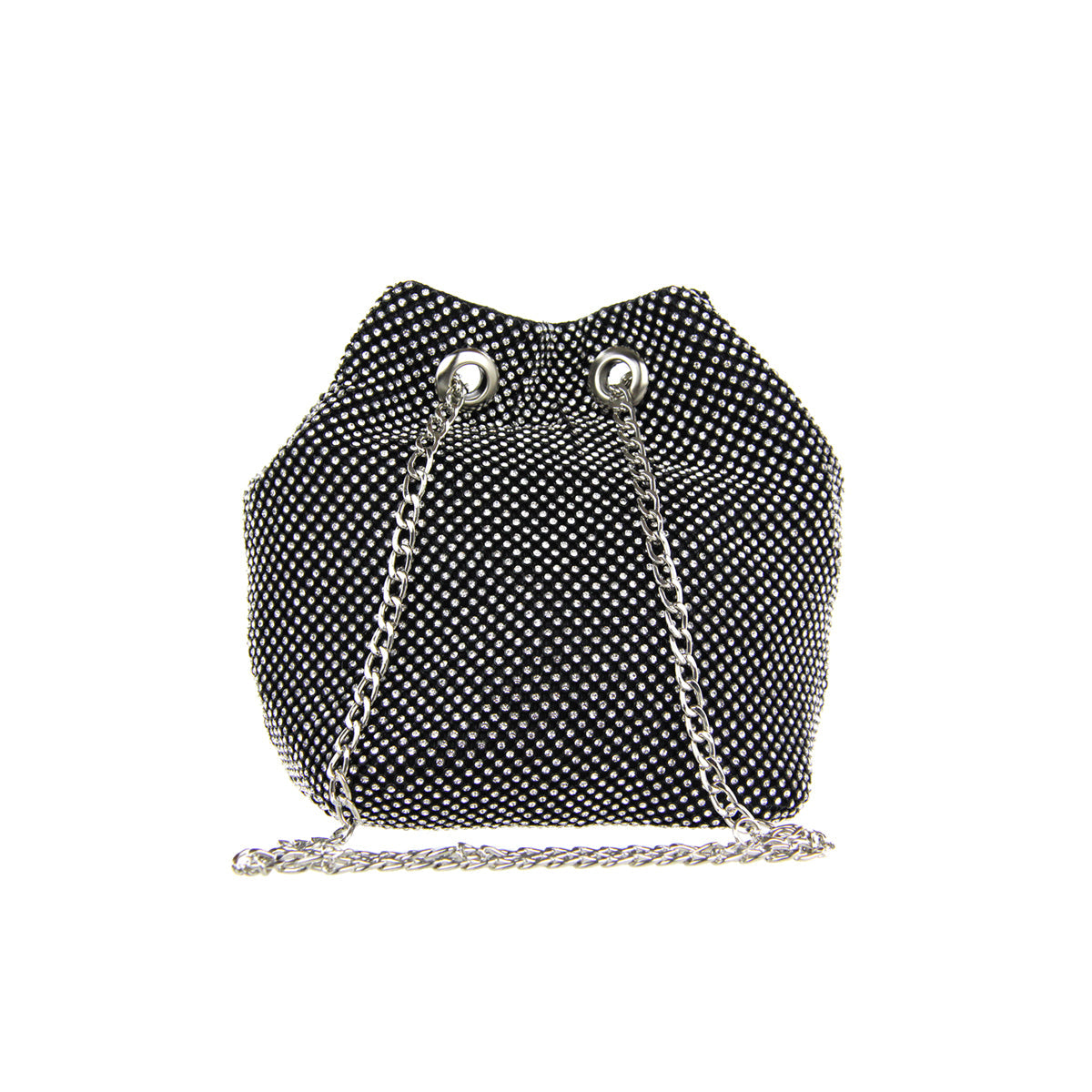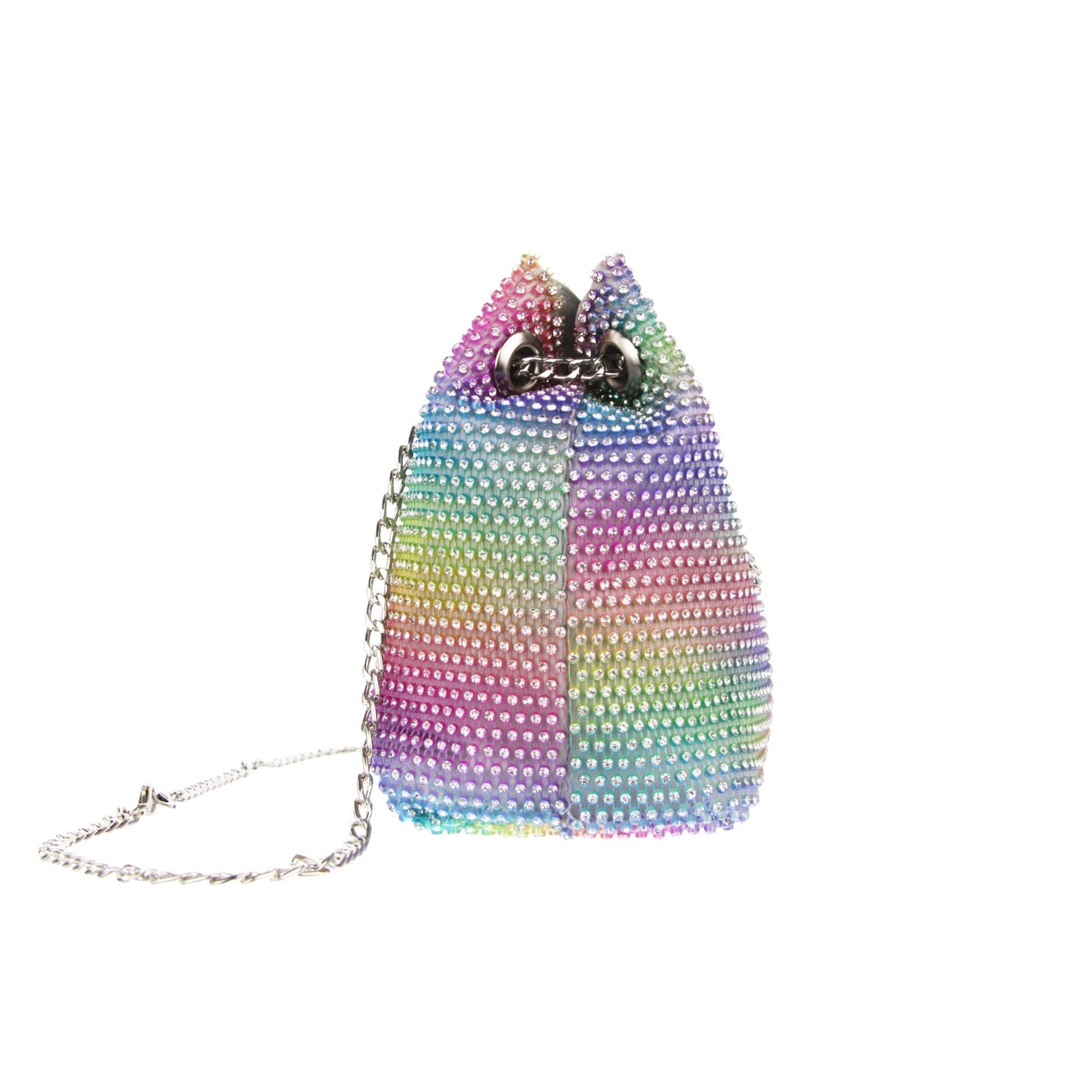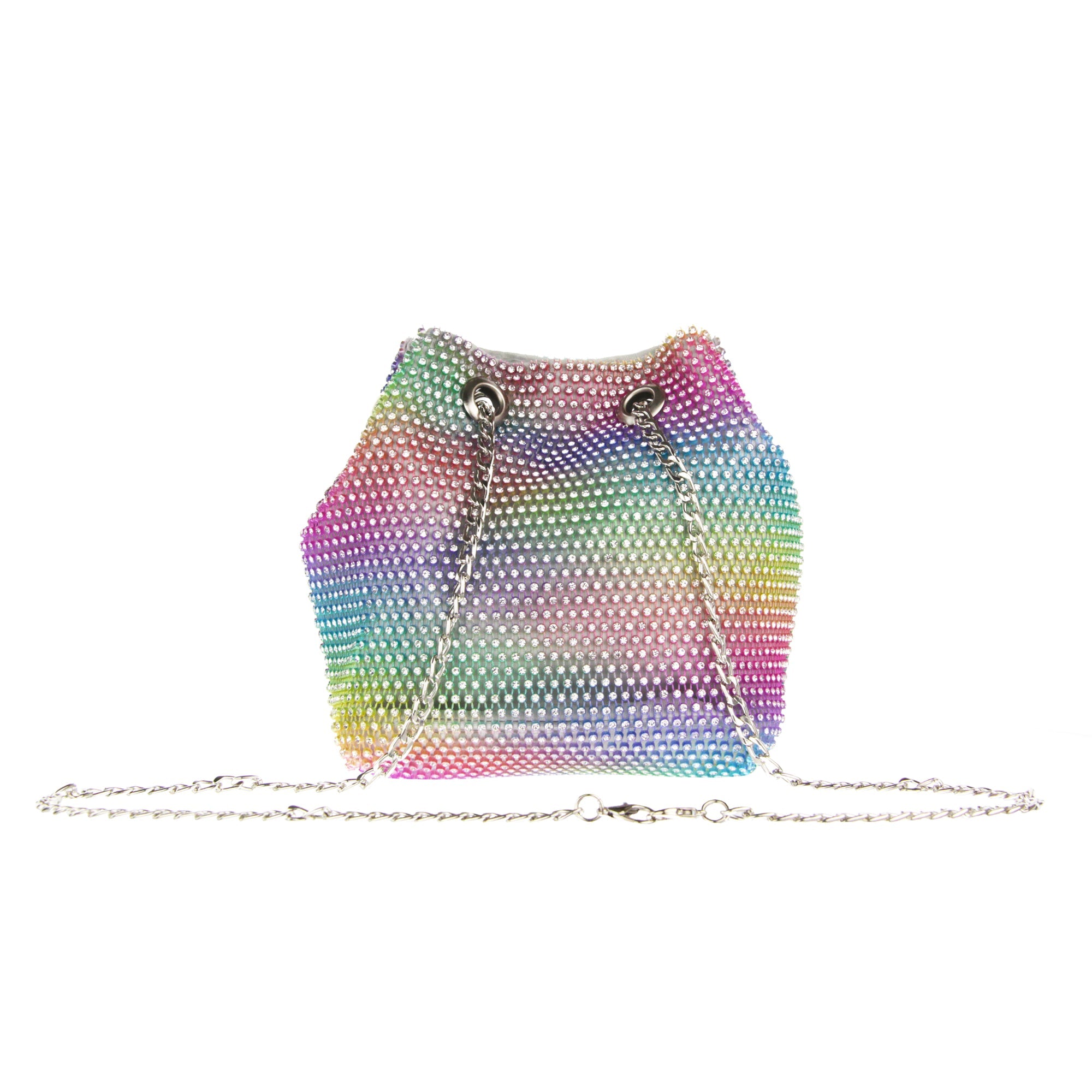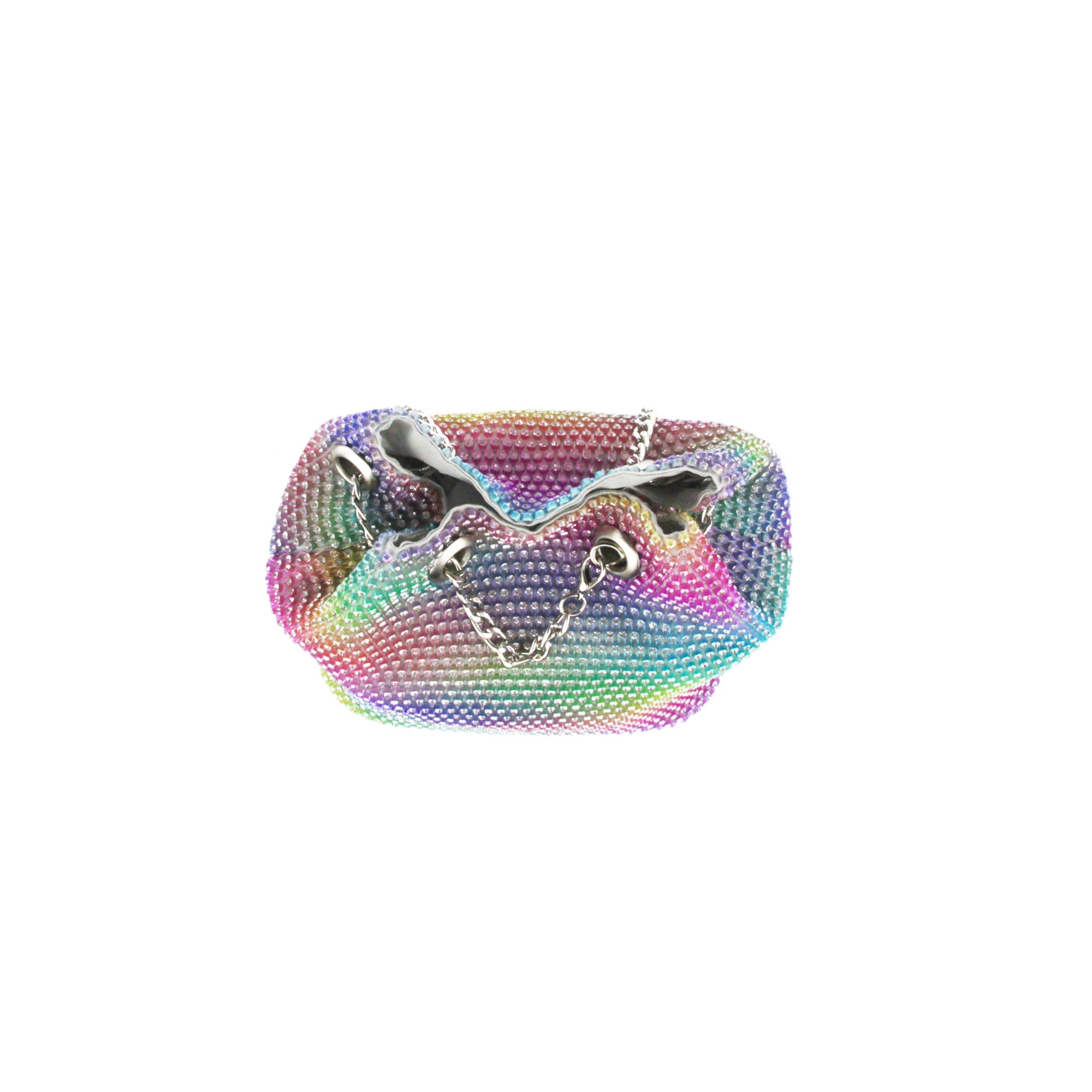 The Cami Phone Crossbody is perfect for an night out! Can fit an iPhone 11Pro Max, as seen in top view photo. The Cami features mesh rhinestones all over, chain strap, and magnetic snap.